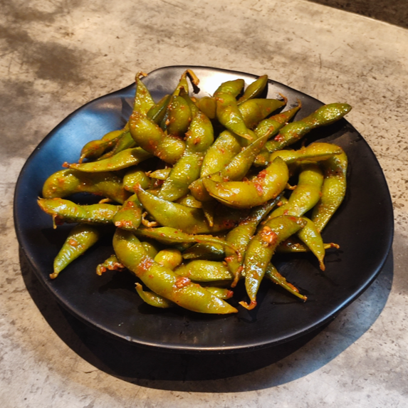 Spicy Edamame Frijol de soya hervido y salteado en salsa picante de la casa.