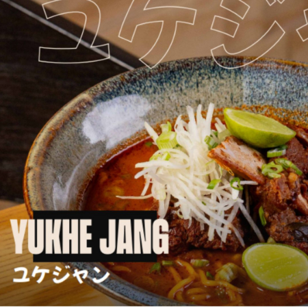 Servido con carne de res picante, espinaca, ajonjolí, nabo rallado y cebollín.