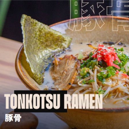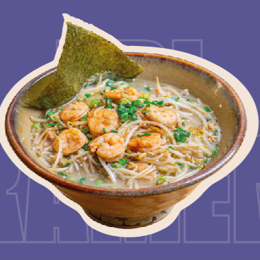 Servido con germen de soya, huevo, cebollín, ajonjolí, charsiu y benishoga.