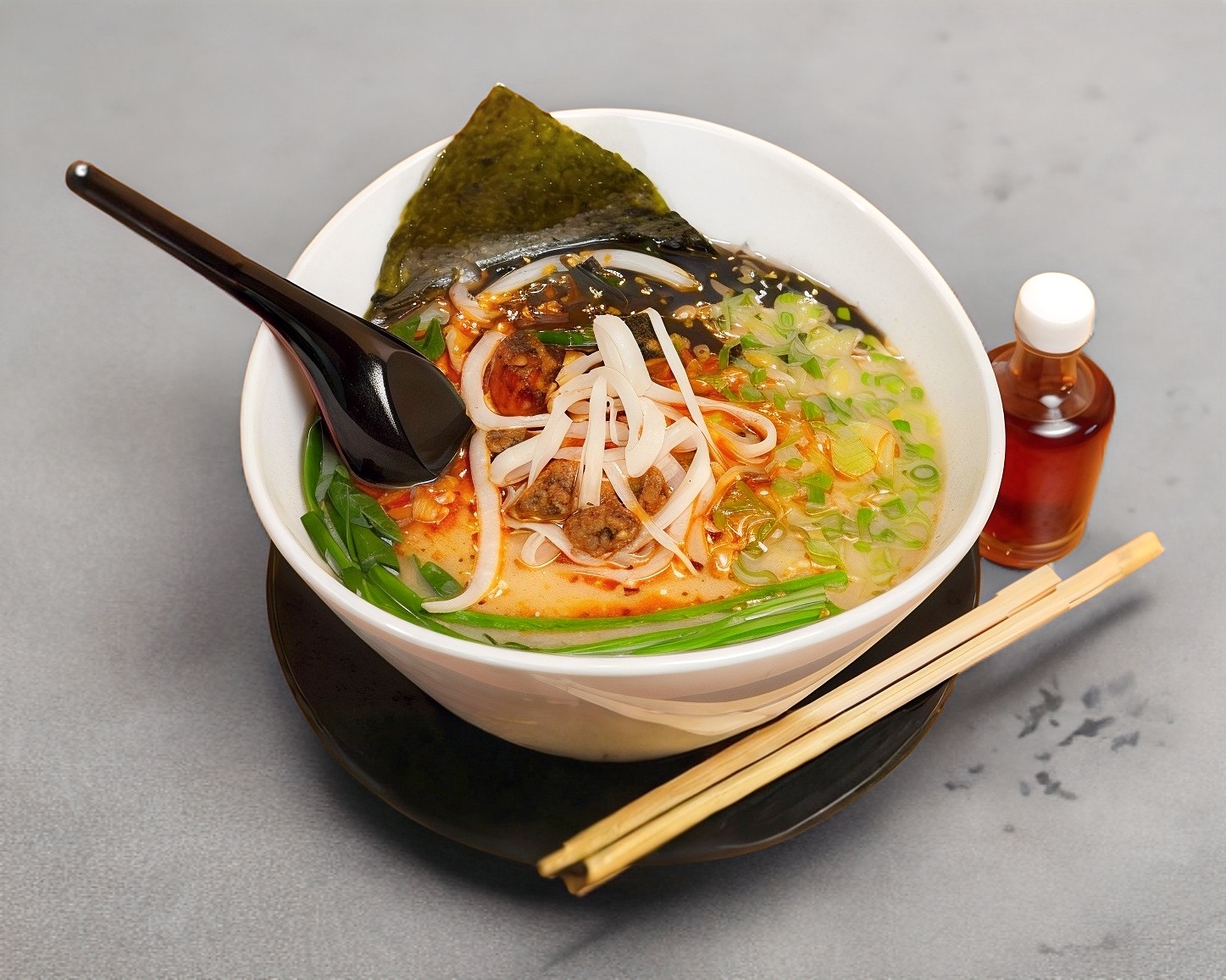 Fondo de ramen con tare picante servido con cebolla, germen de soya, charsiu salteados, cebollín, rábano y arúgula, picante al gusto del 1 al 10.