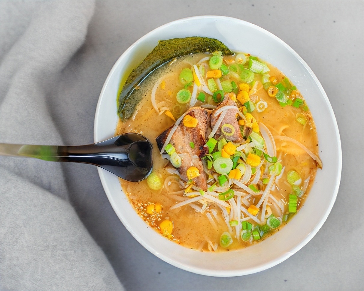 Clásico fondo de ramen y agregamos una preparación especial de miso se sirve con germen de soya, cebolla, elote, charsiu y cebollín.