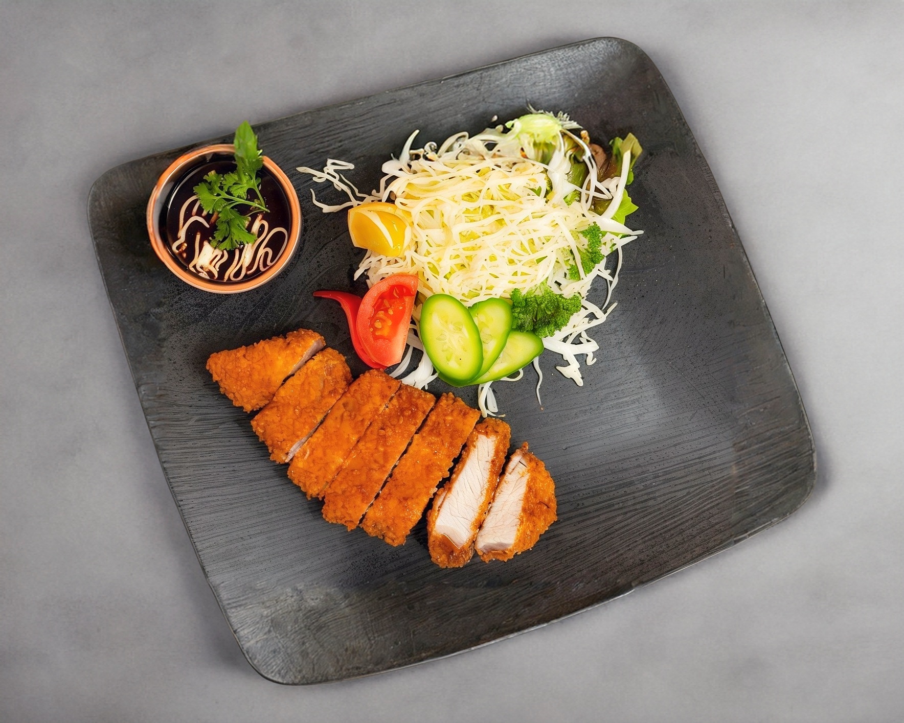 Trozos de chikinkatzu, aderezo especial, salsa tonkatzu, queso empanizado, col, tomate y pepinillos.