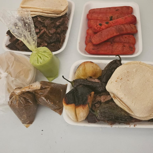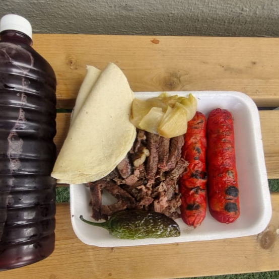 Orden Familiar ( 750g de carne asada), 8 mitades de salchicha, cebolla asada, 3 chiles toreados, charola de frijoles, 2 bebidas