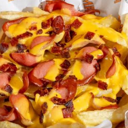 Papas fritas con queso y tocino deshidratado, complemento salsa y chile jalapeño