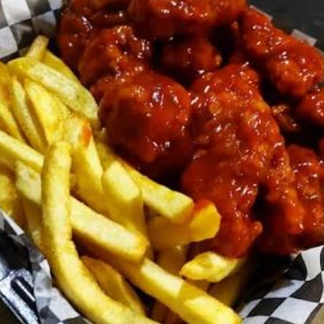 Bonneles en salsa BBQ acompañado de papas fritas aderezo zanahoria y apio