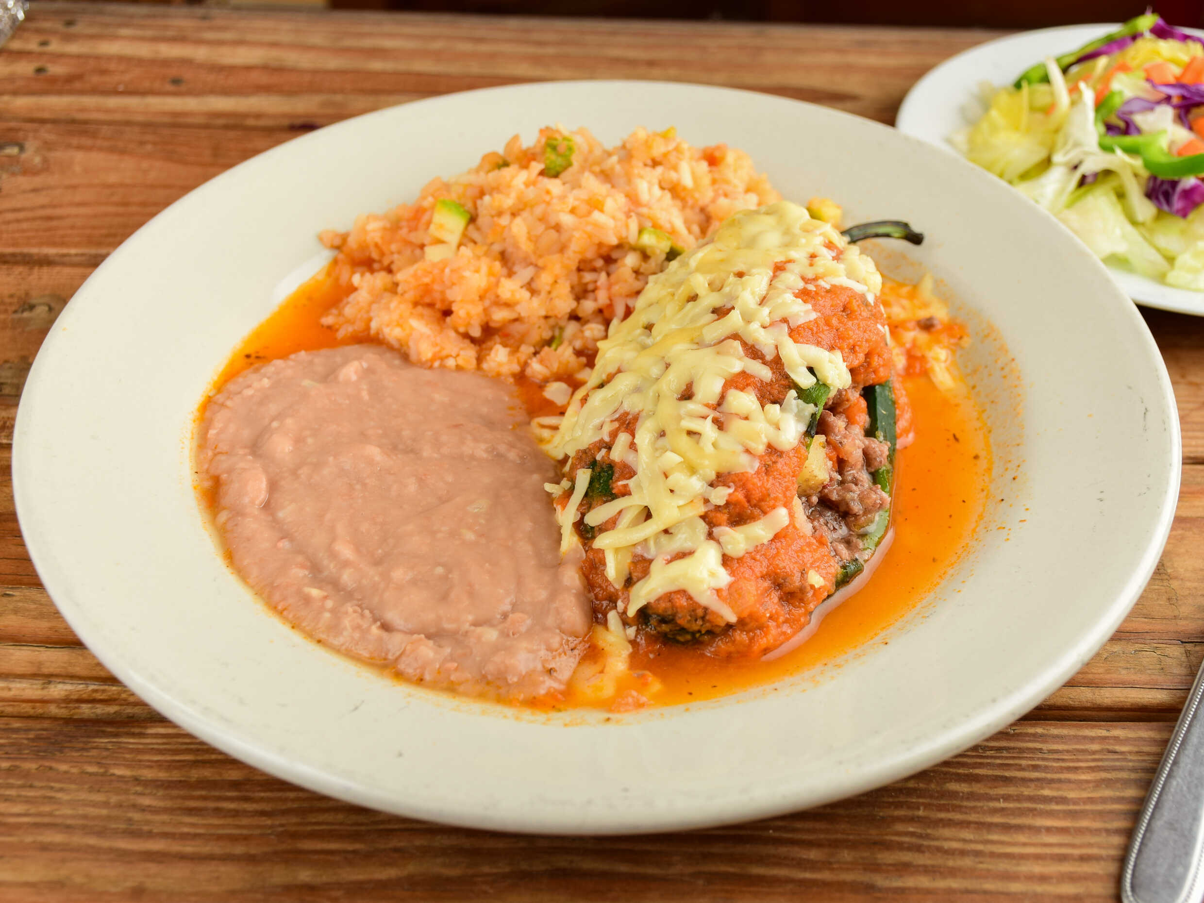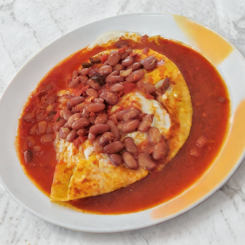 Bañados en salsa roja con queso gratinado, con arroz y frijolitos o ensalada de la casa