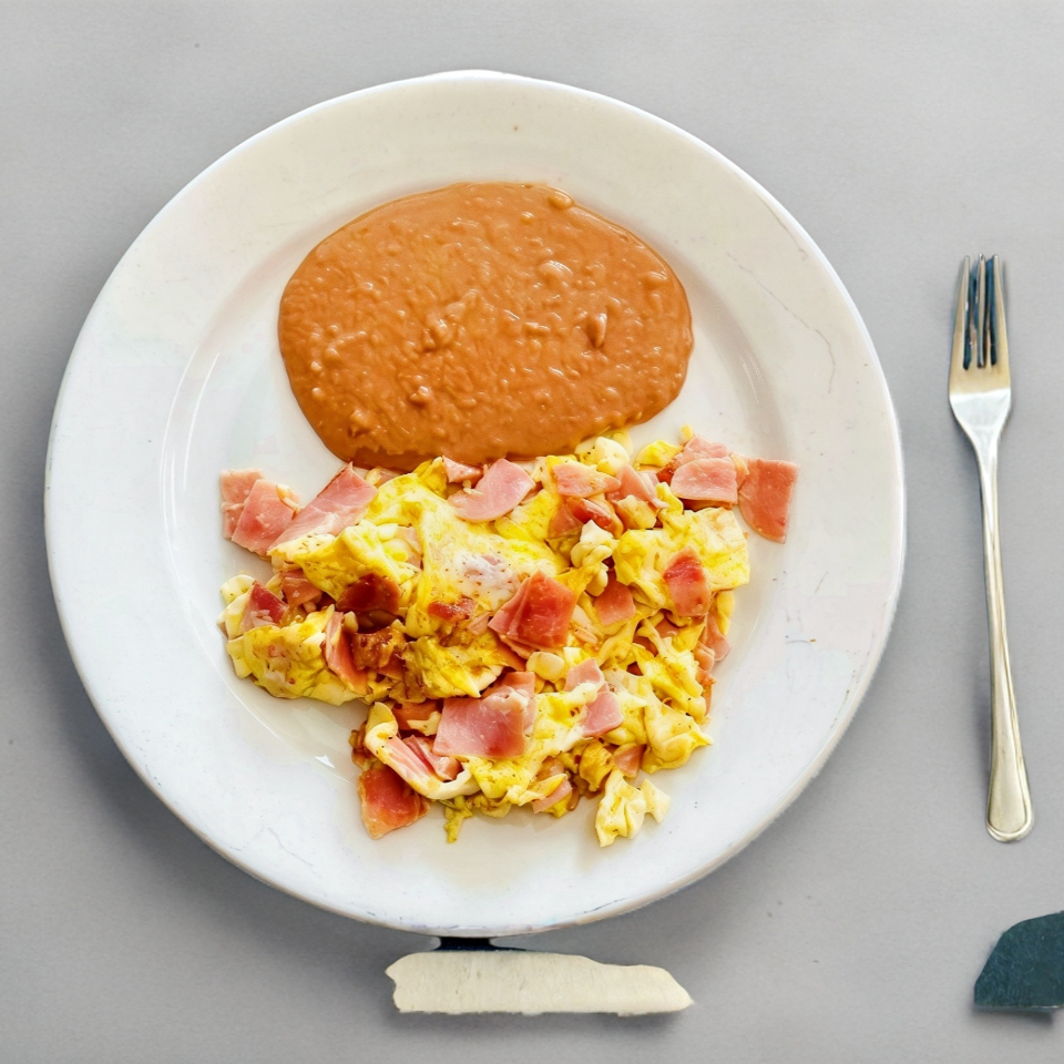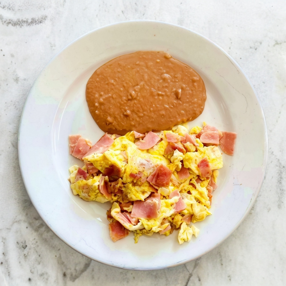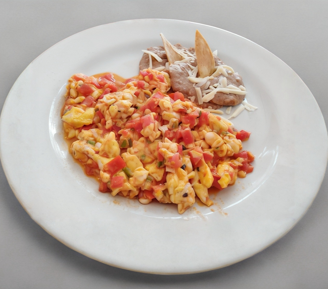 2 huevos revueltos con tocfino doradito y frijolitos.