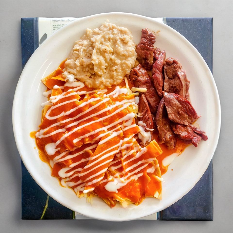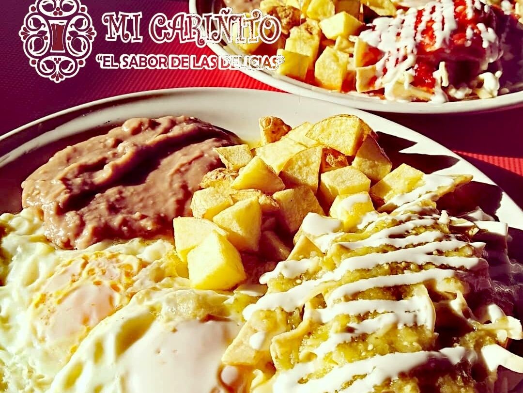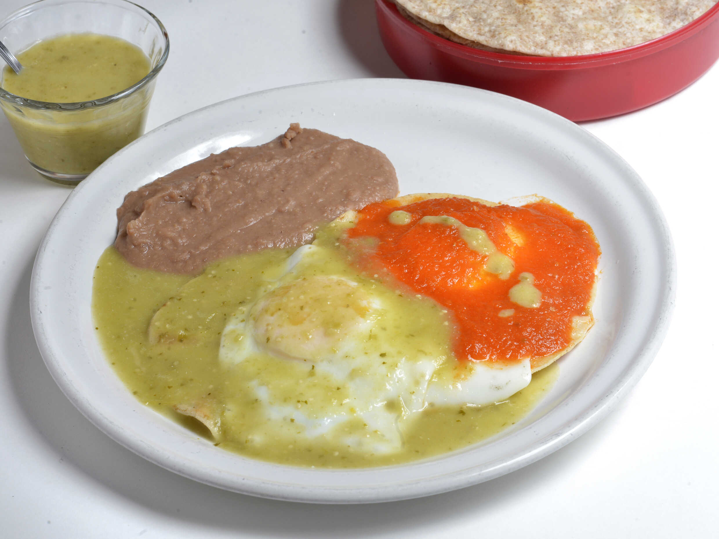 chilaquiles con queso crema y la salsa de tu eleccion, guiso a tu eleccion huevos estrellados y frijolitos