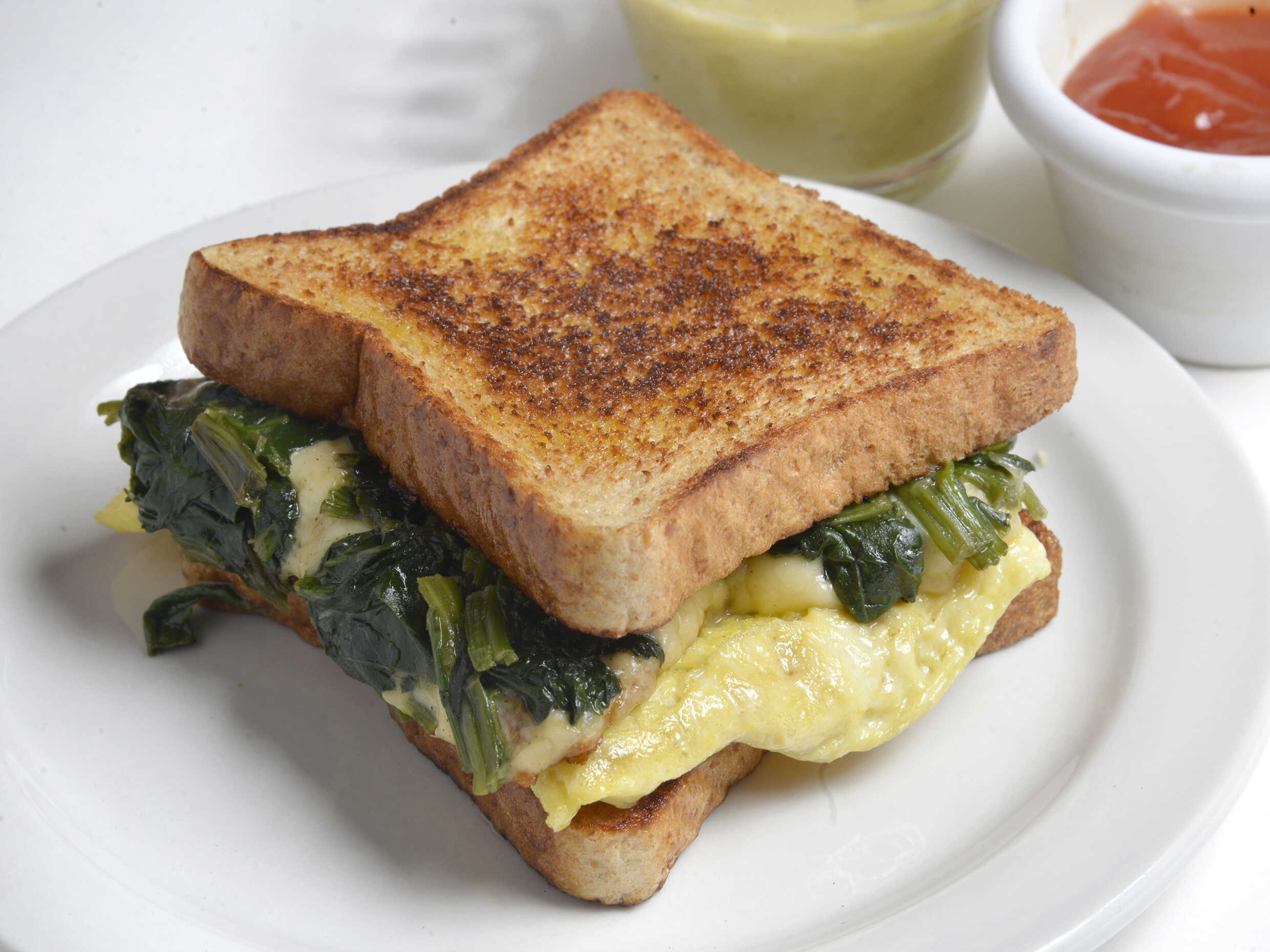 pan integral tostadito, queso gratinado, huevo revuelto y espinacas guisaditas con cedbolla
