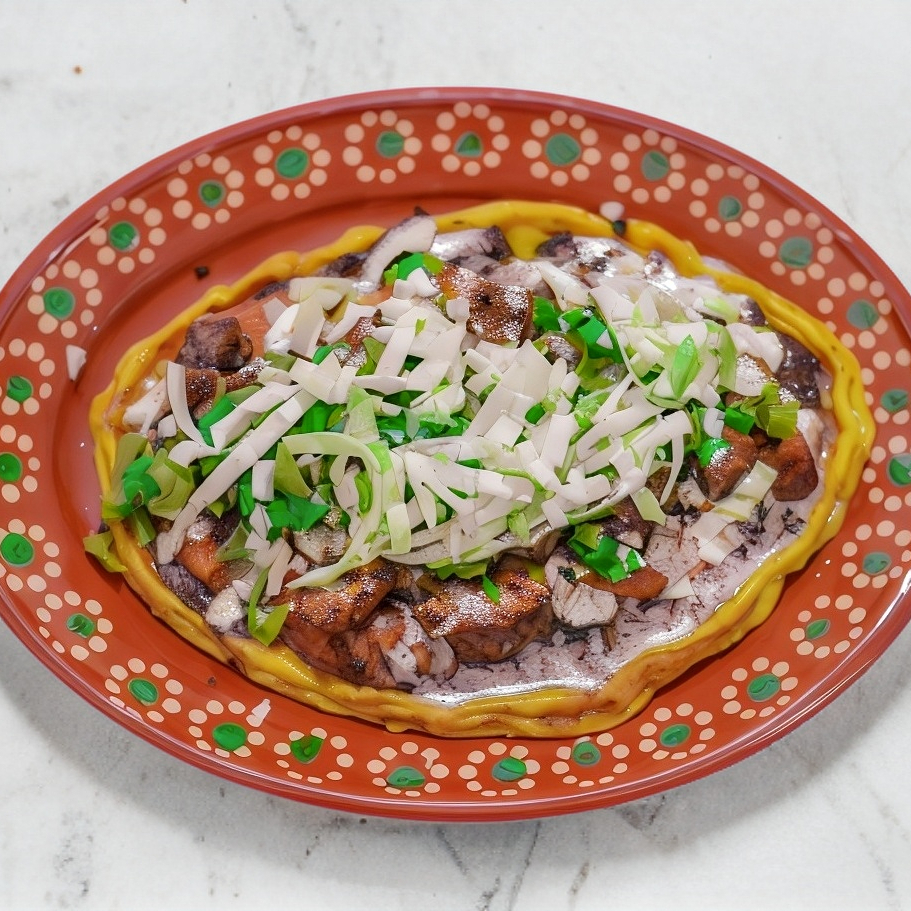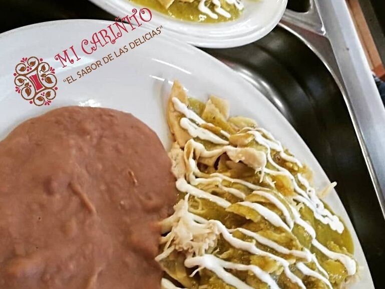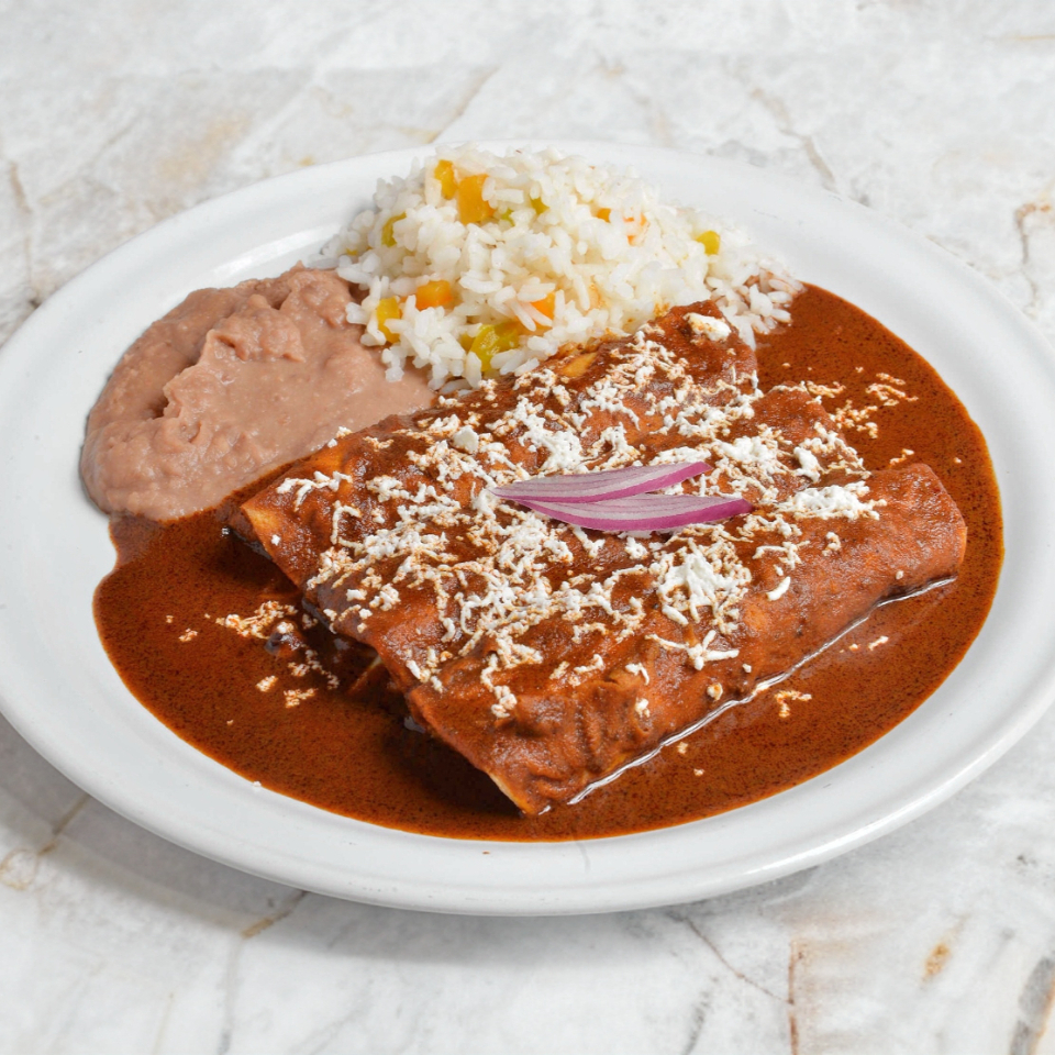 Bañadas con nuestra delicia de mole con arroz y frijolitos o ensalada de la casa