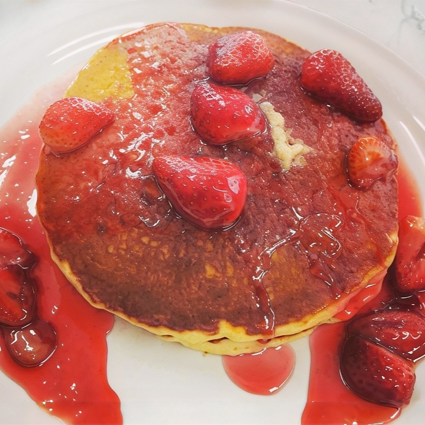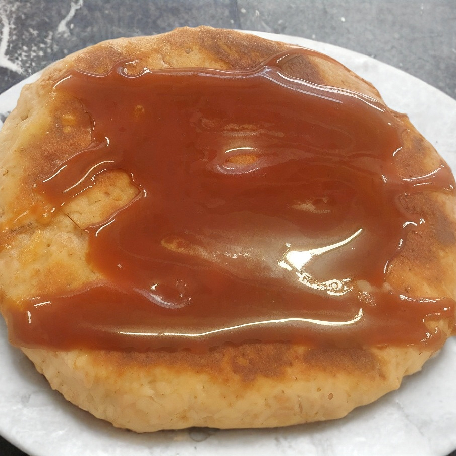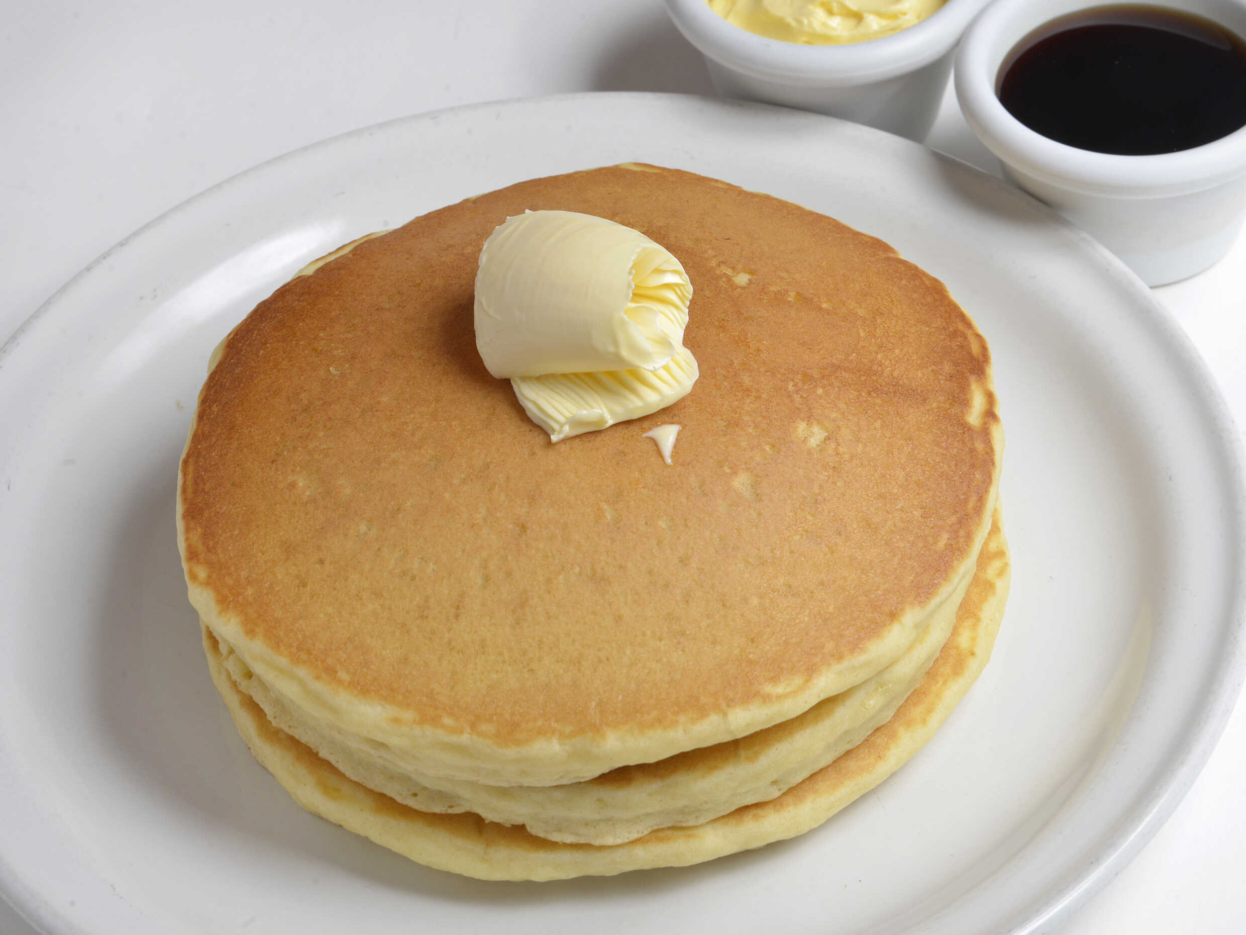 3 piezas de esponjaditos hotcakes acompañados de miel y mantequilla