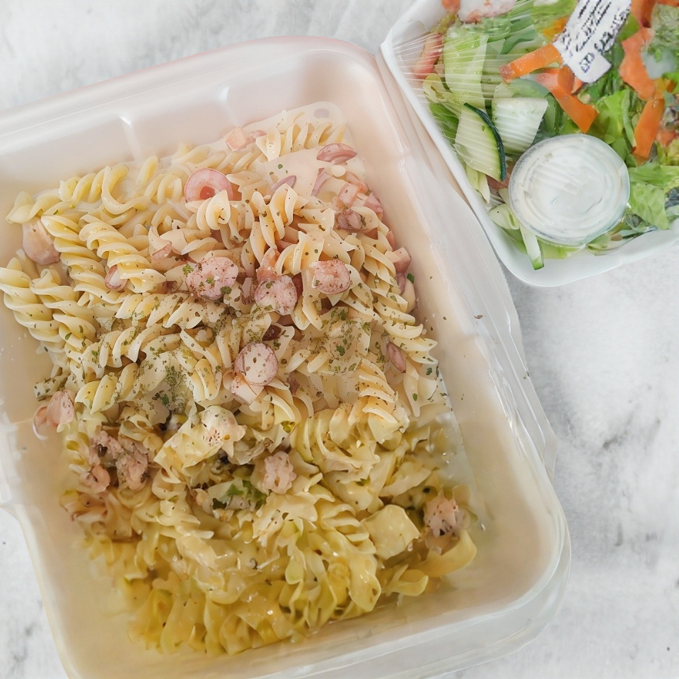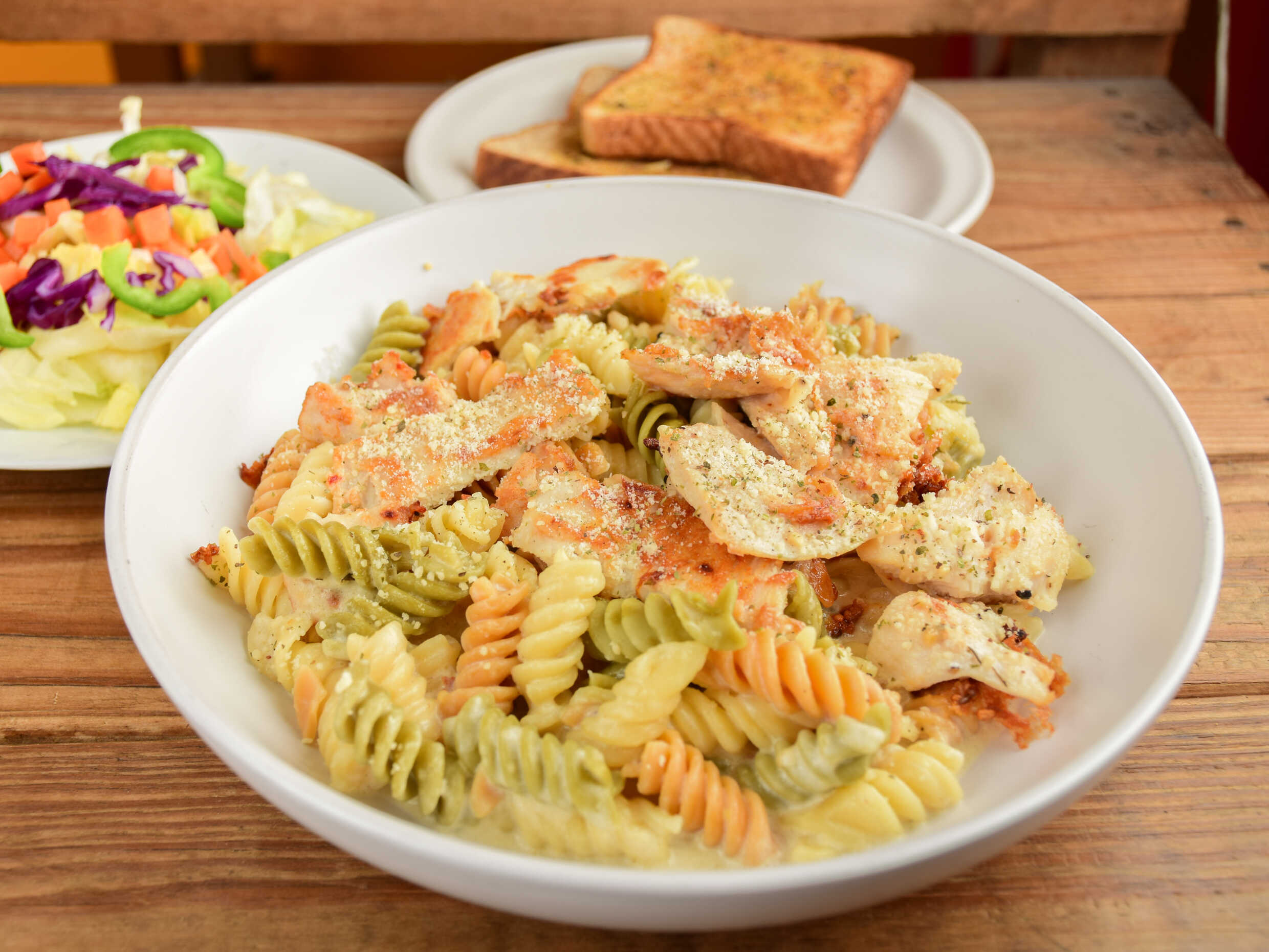 Con ensalada de la casa y pan con mantequilla de ajo y perejil