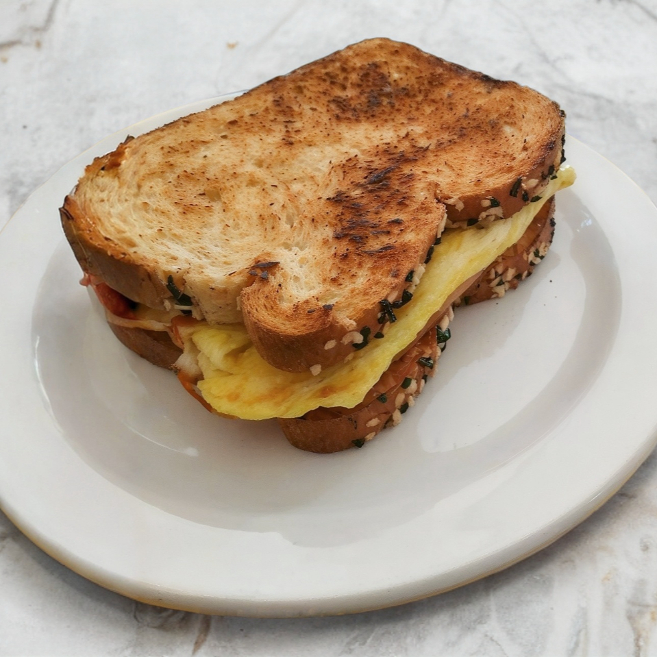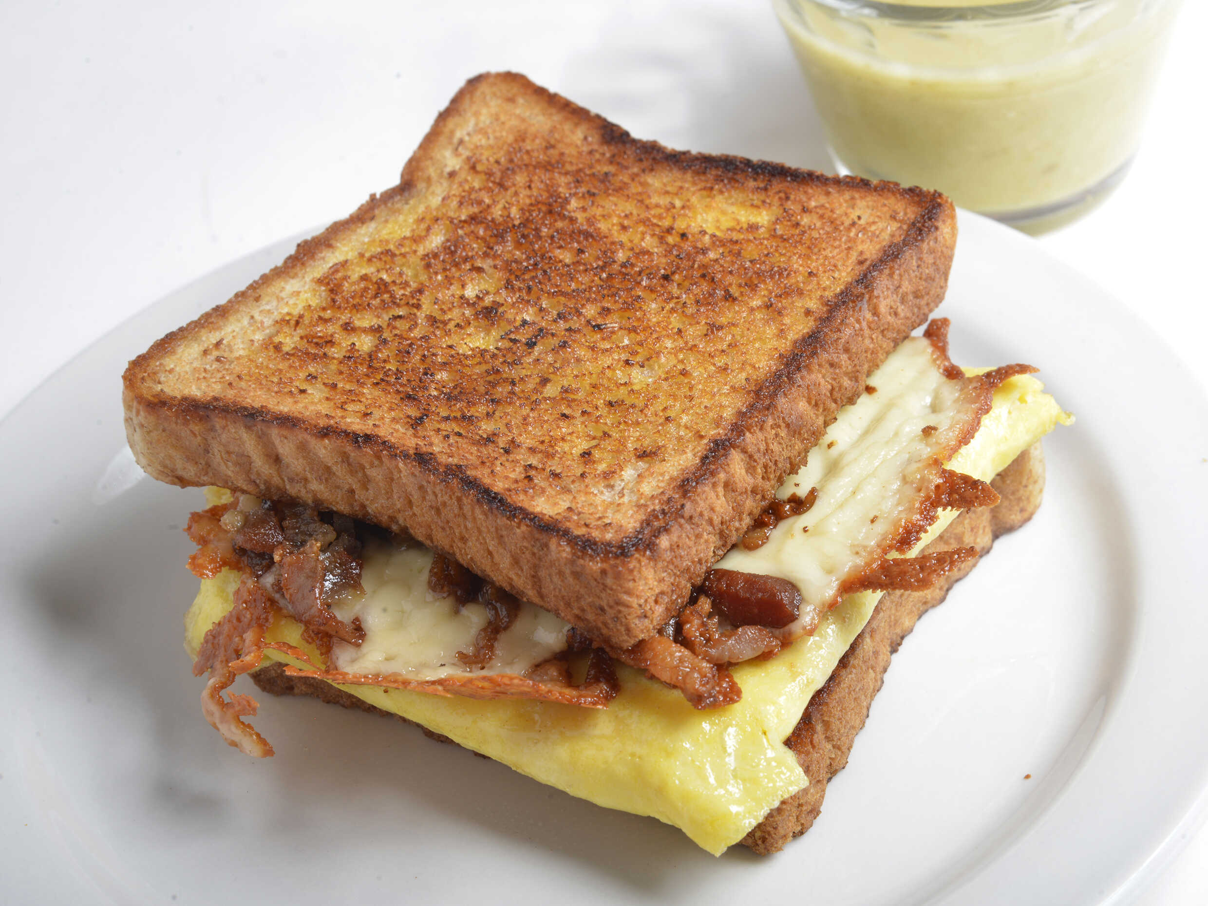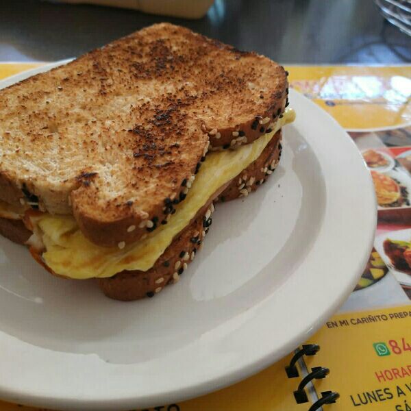 pan integral tostadito, queso gratinado, huevo revuelto y tocino doradito una delicia