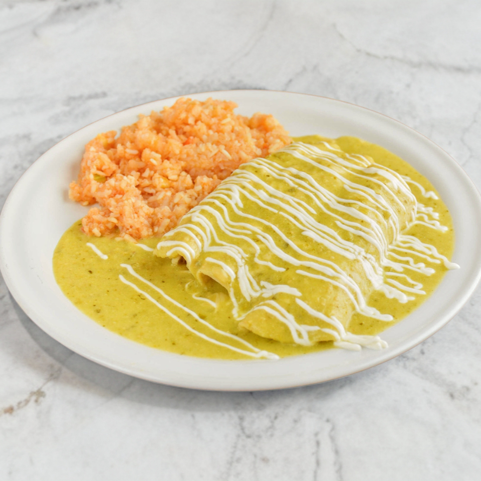 Bañadas con salsa verde cremosa con arroz y frijolitos o ensalada de la casa