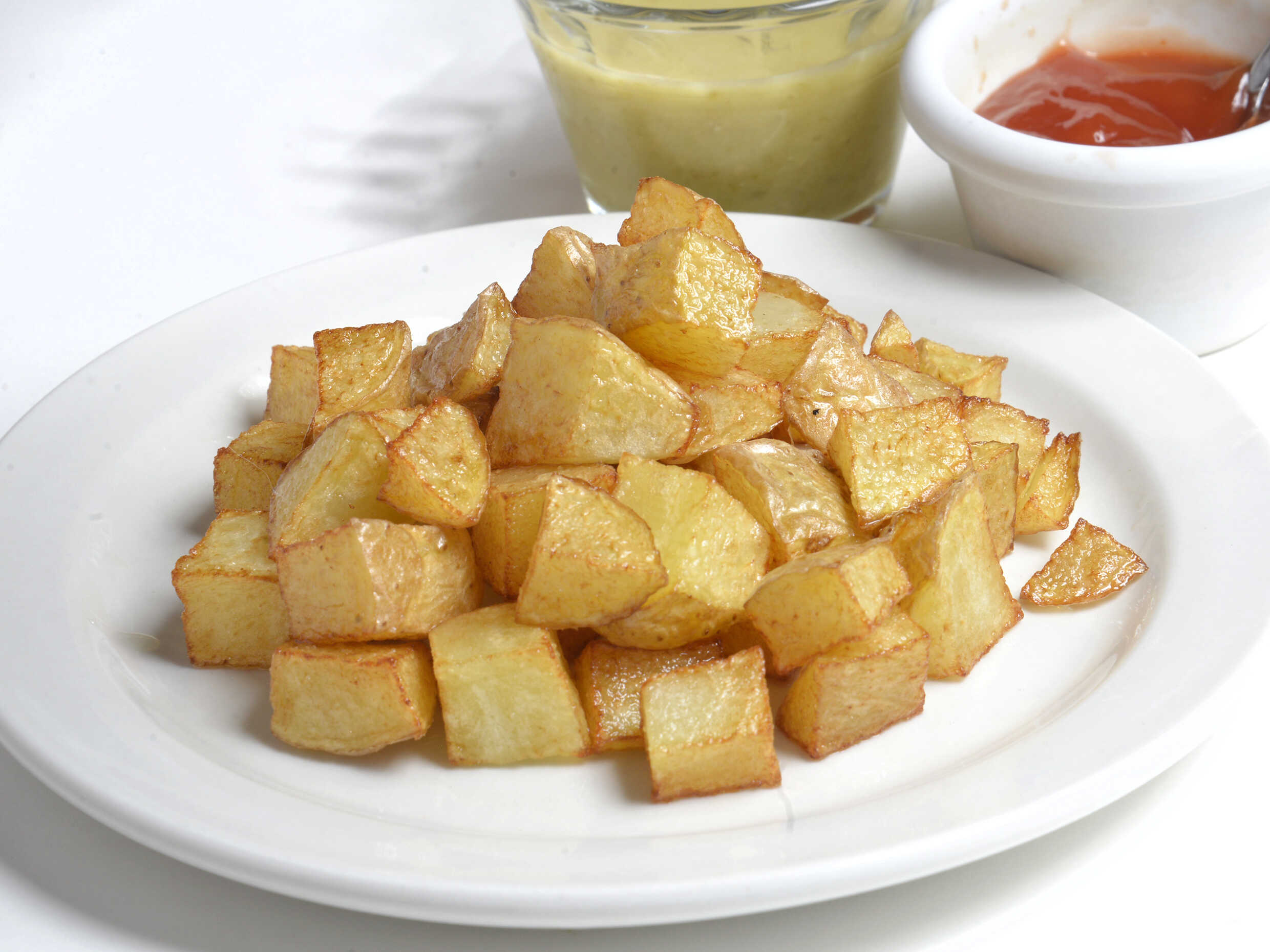 2 huevos esrellados, papitas fritas en cubitos, pocion de chilaquiles con queso y crema , salsa de su eleccion y frijolitos.