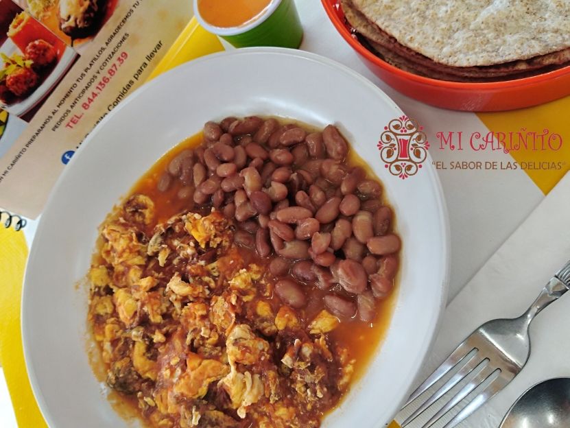 carne seca doradita con 2 huevos revueltos y salsa de tomate, acompañada de frijolitos