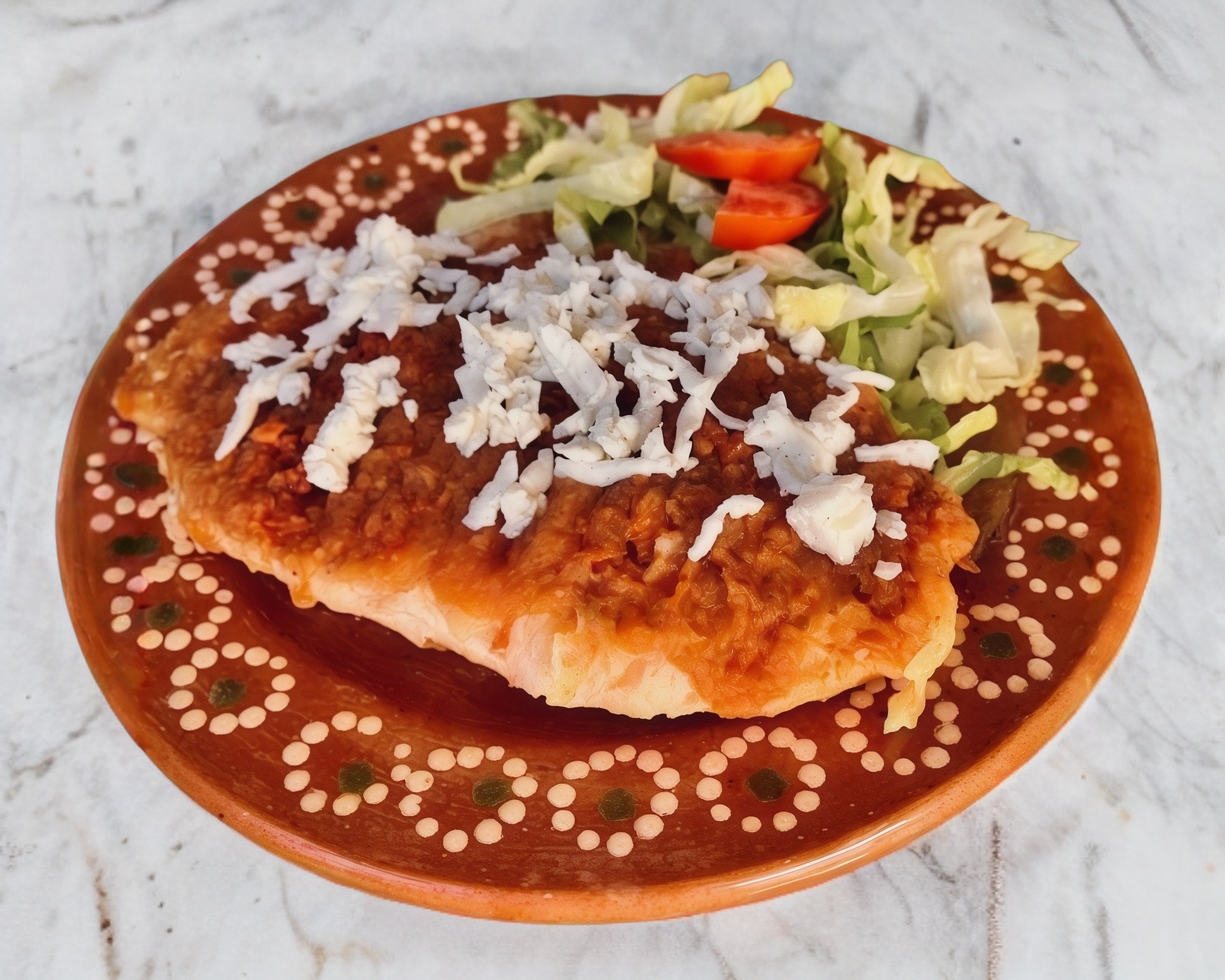 mitad de bolillo con frijol y queso gratinado, con chorizo, bañado en salsa de tomate, acompañado de ensalada y panela