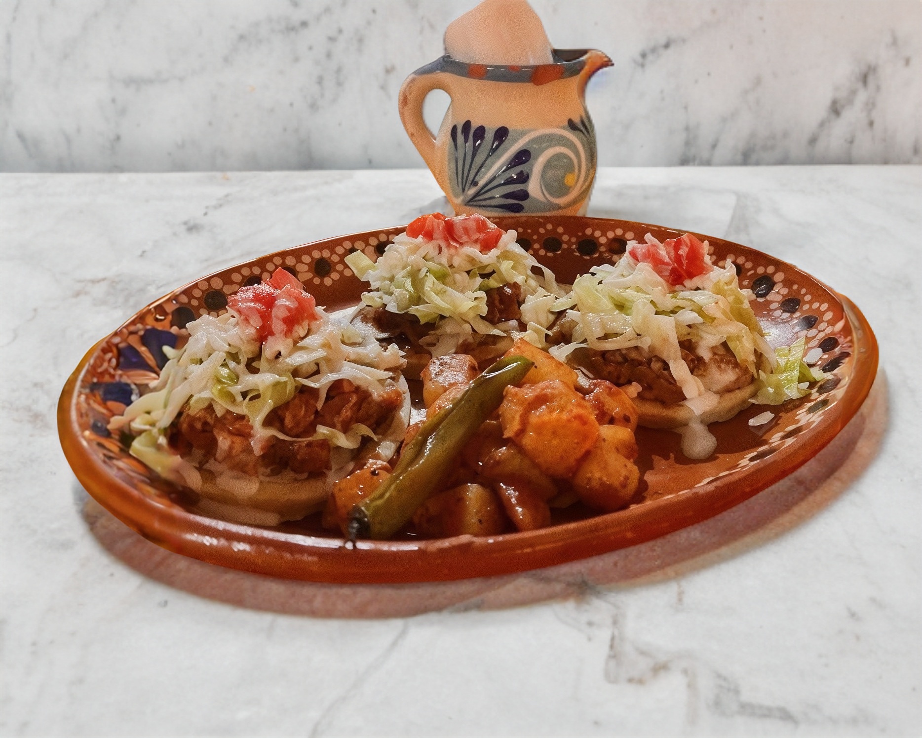 3 piezas de sopes de deshebrada, picadillo o chicharron, con ensalada, acompañado de papas sancochadas