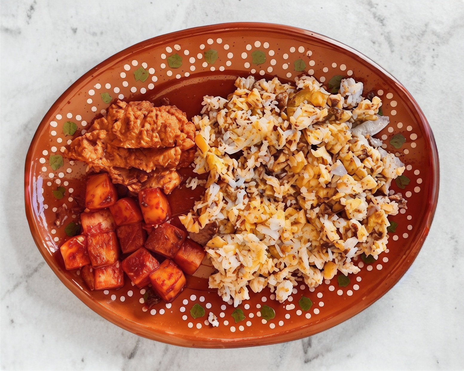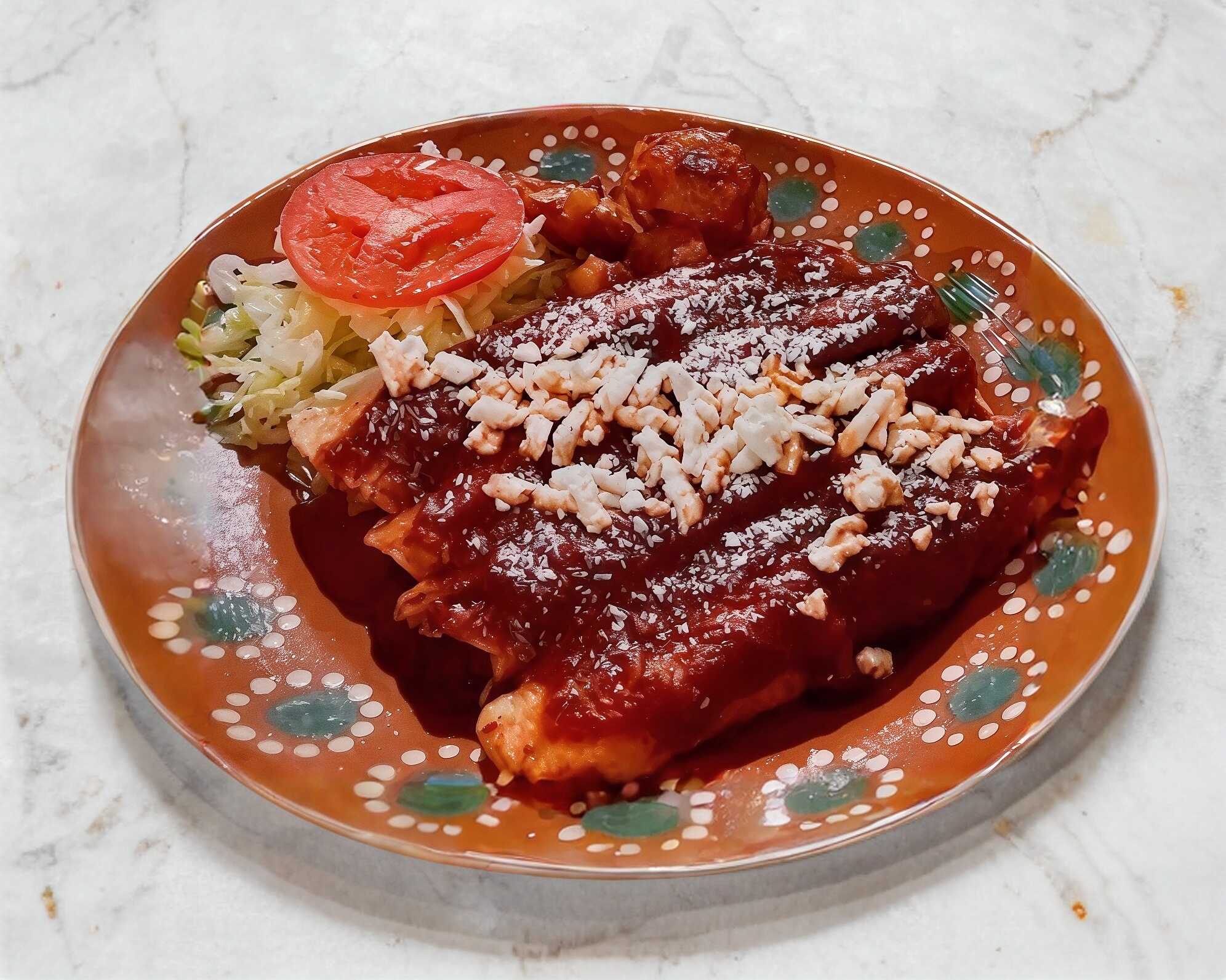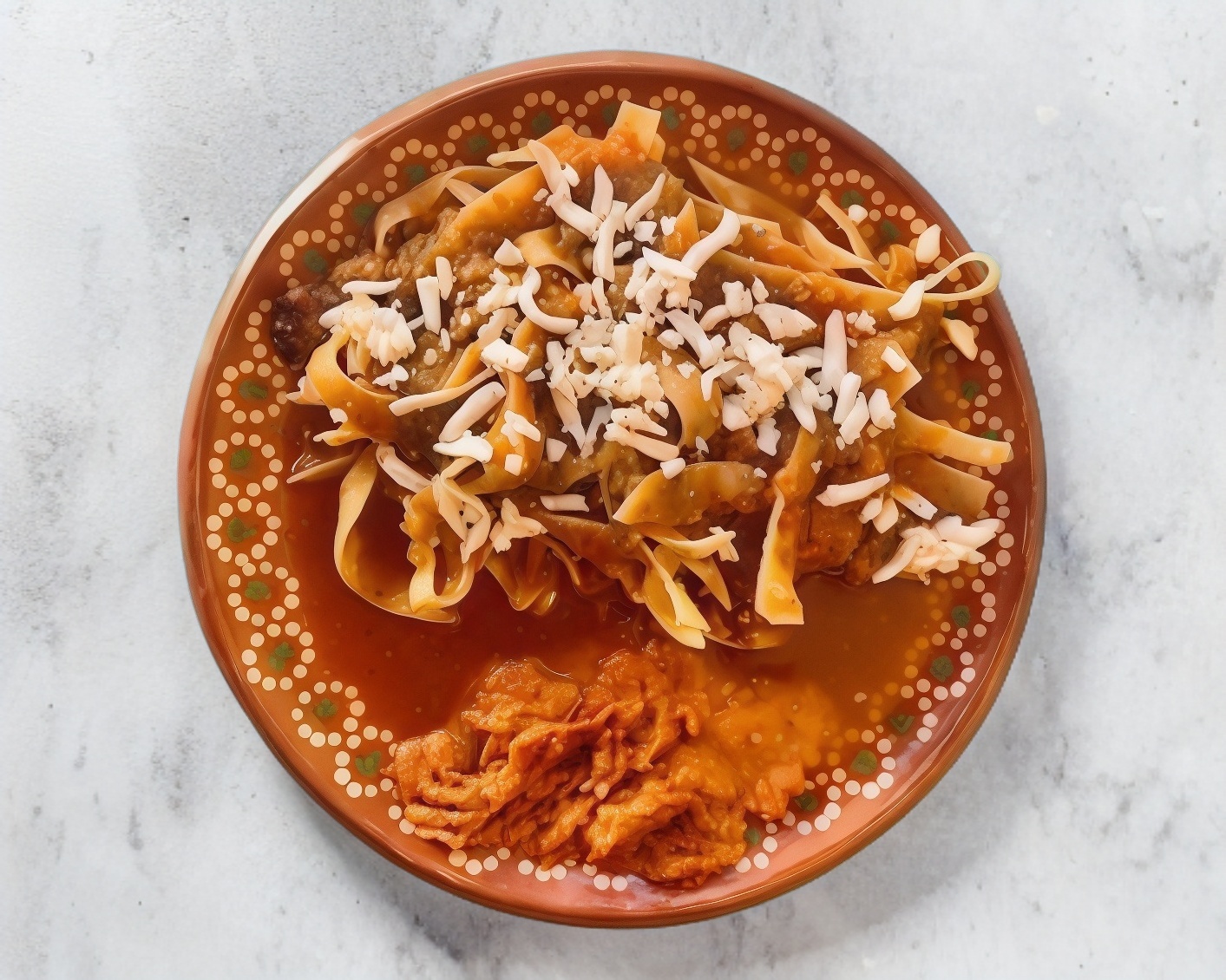 frituras de tortilla con pollo, bañadas en salsa roja de tomate con queso gratinado, acompañados de frijoles