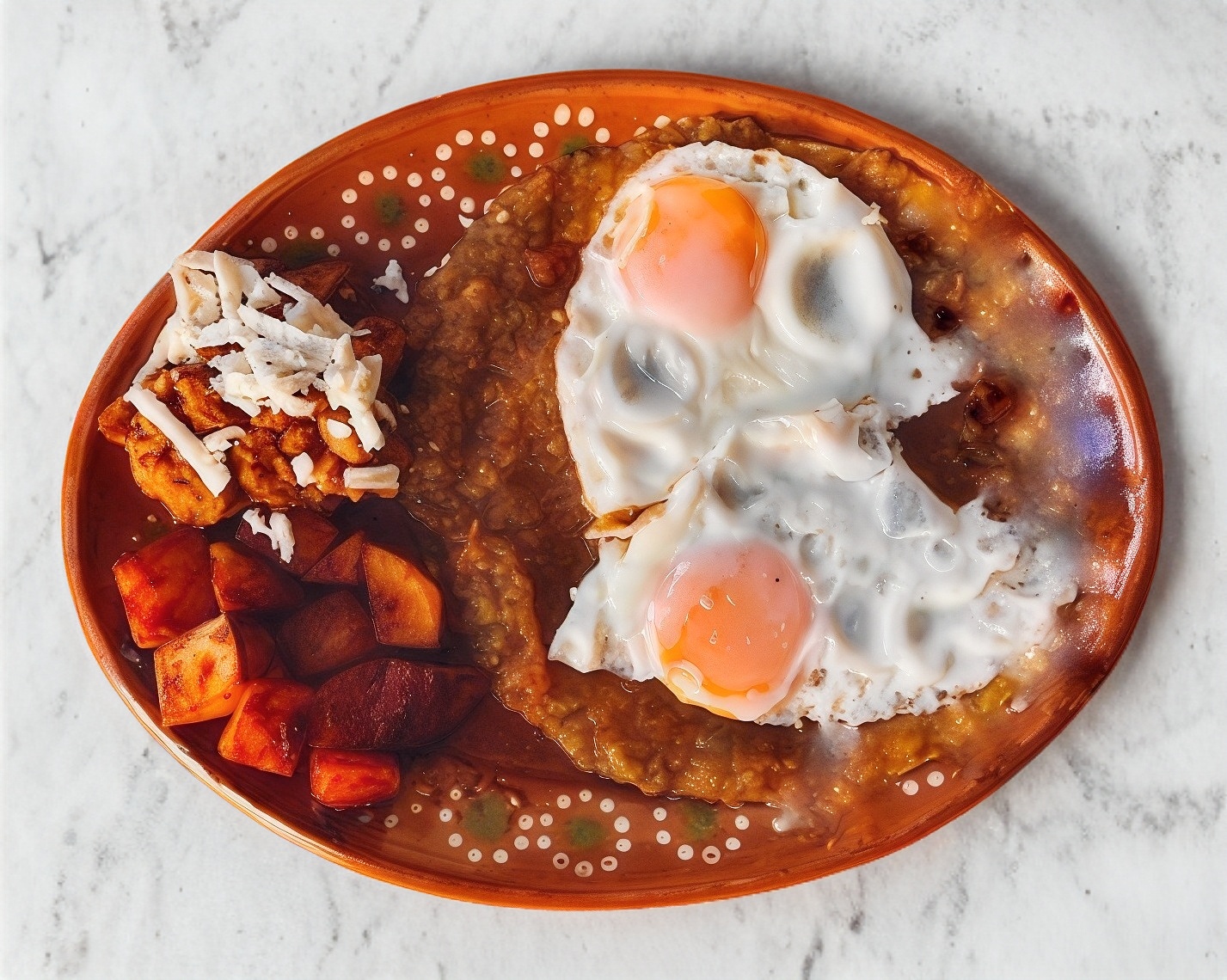 2 huevos montados en tortillas de nixtamal bañados en salsa ranchera, acopañados de papas sancochadas y frijoles