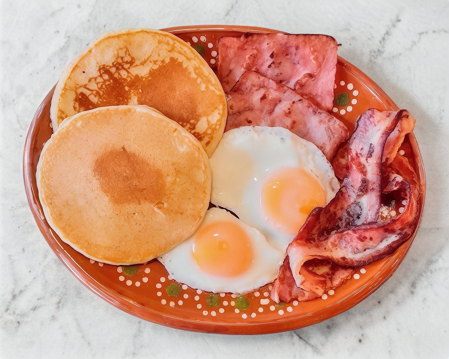 2 piezas de huevo montados en jamon, acompañado de tocino y 2 piezas de hotcakes