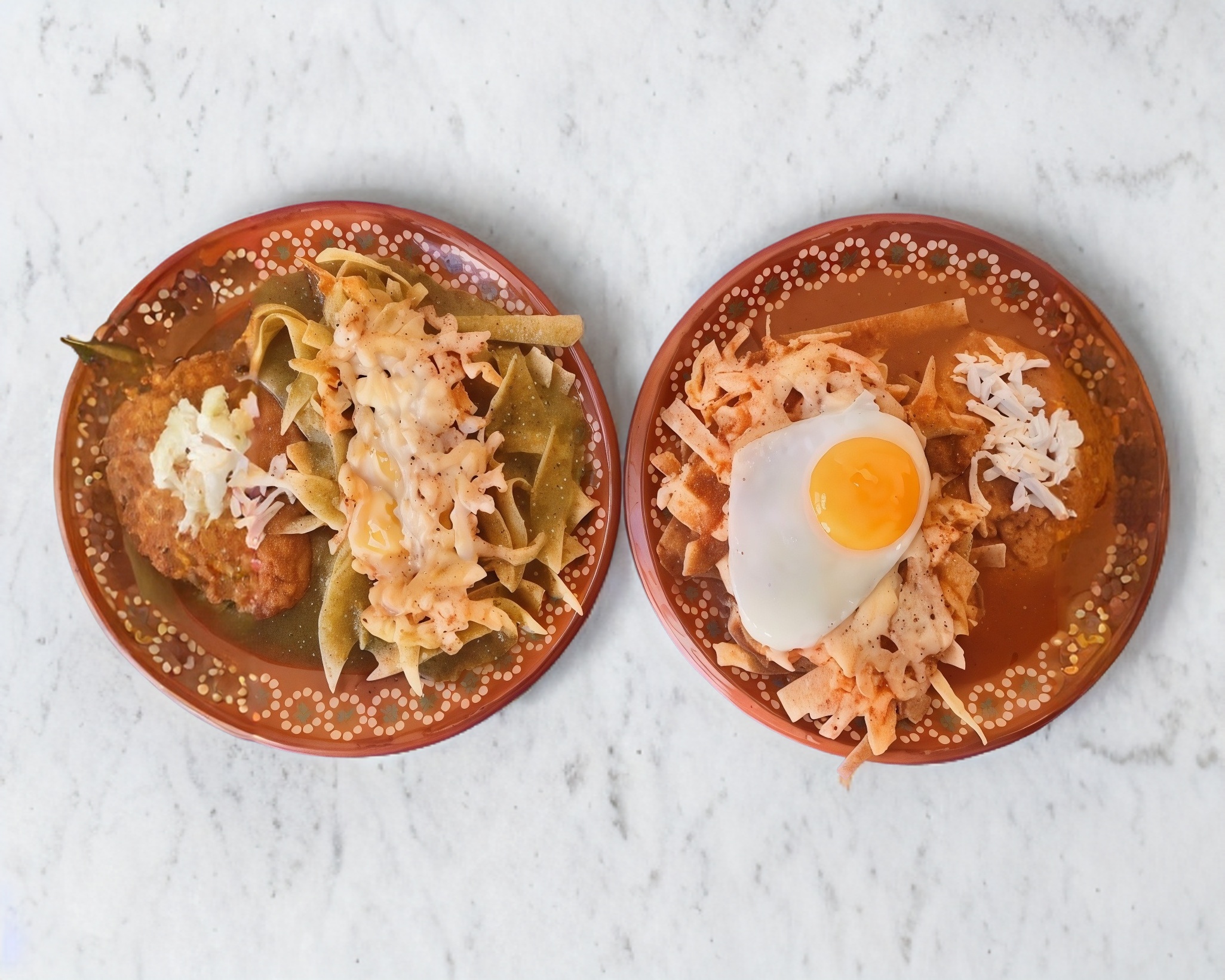 2 piezas de huevos montados en tortillas de nixtamal bañados en salsa roja y verde, acomapañados de frijoles