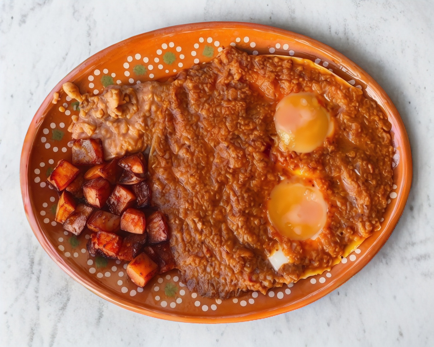 2 huevos montados en tortillas de nixtamal, bañados en salsa de la suegra (salsa picosa), acompañados de papas sancochadas y frijoles