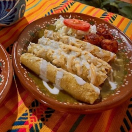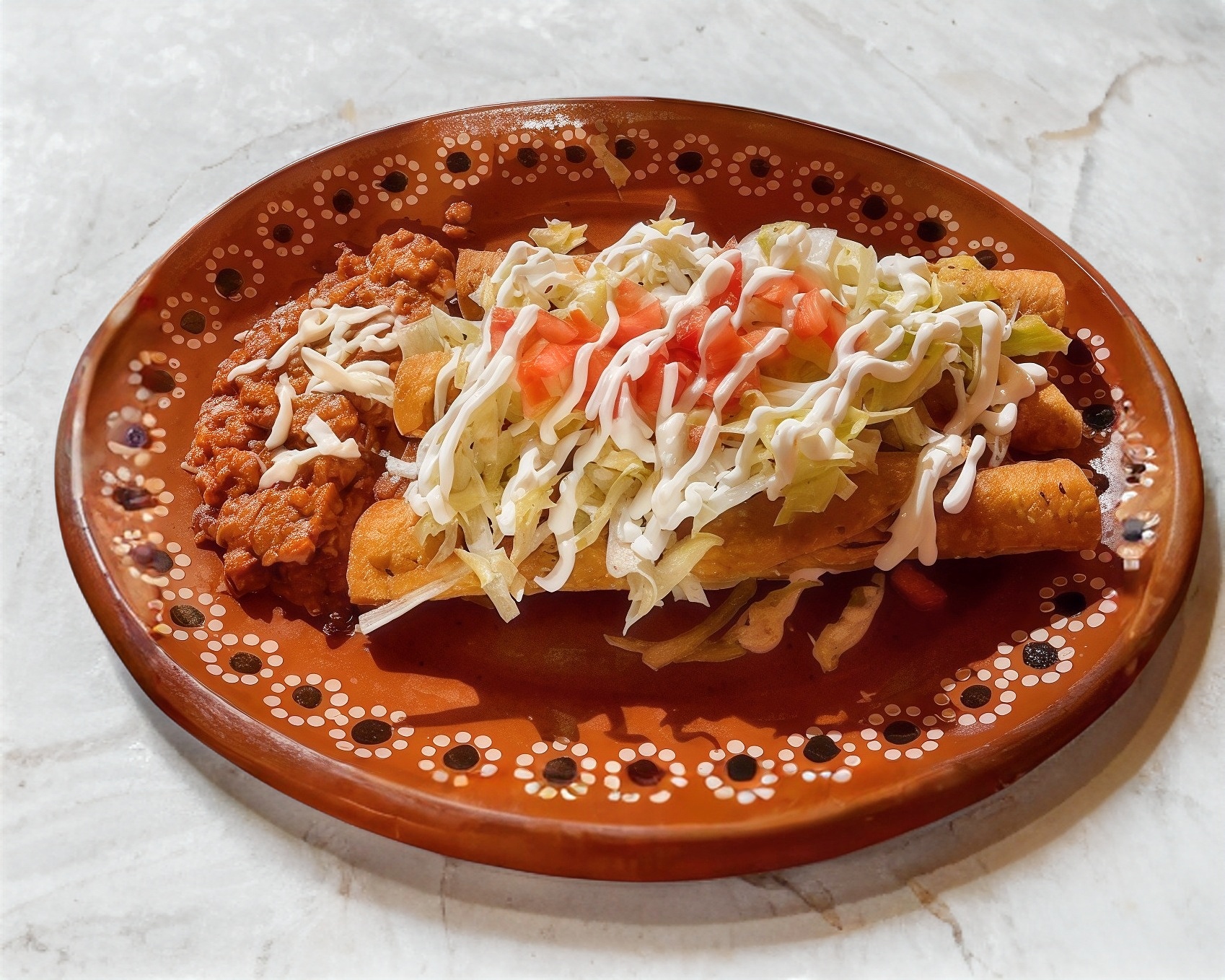 5 piezas de flautas fritas de deshebrada, con ensalada, crema y queso panela
