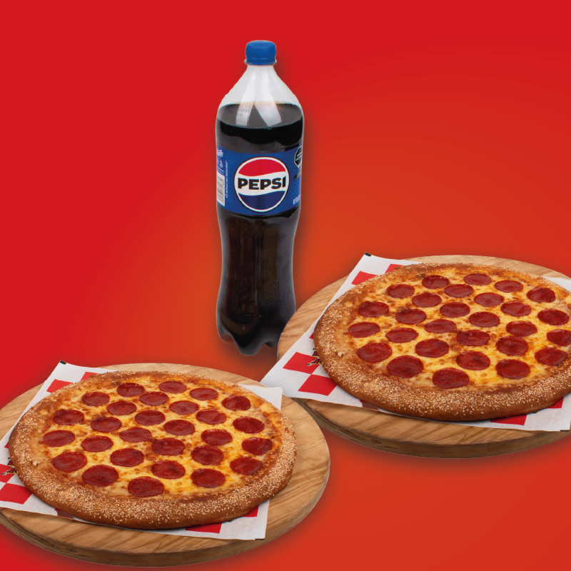 Disfruta de 2 Pizzas Grande de 14" Clásica de Pepperoni y un refrescante Refresco de la Familia Pepsi.