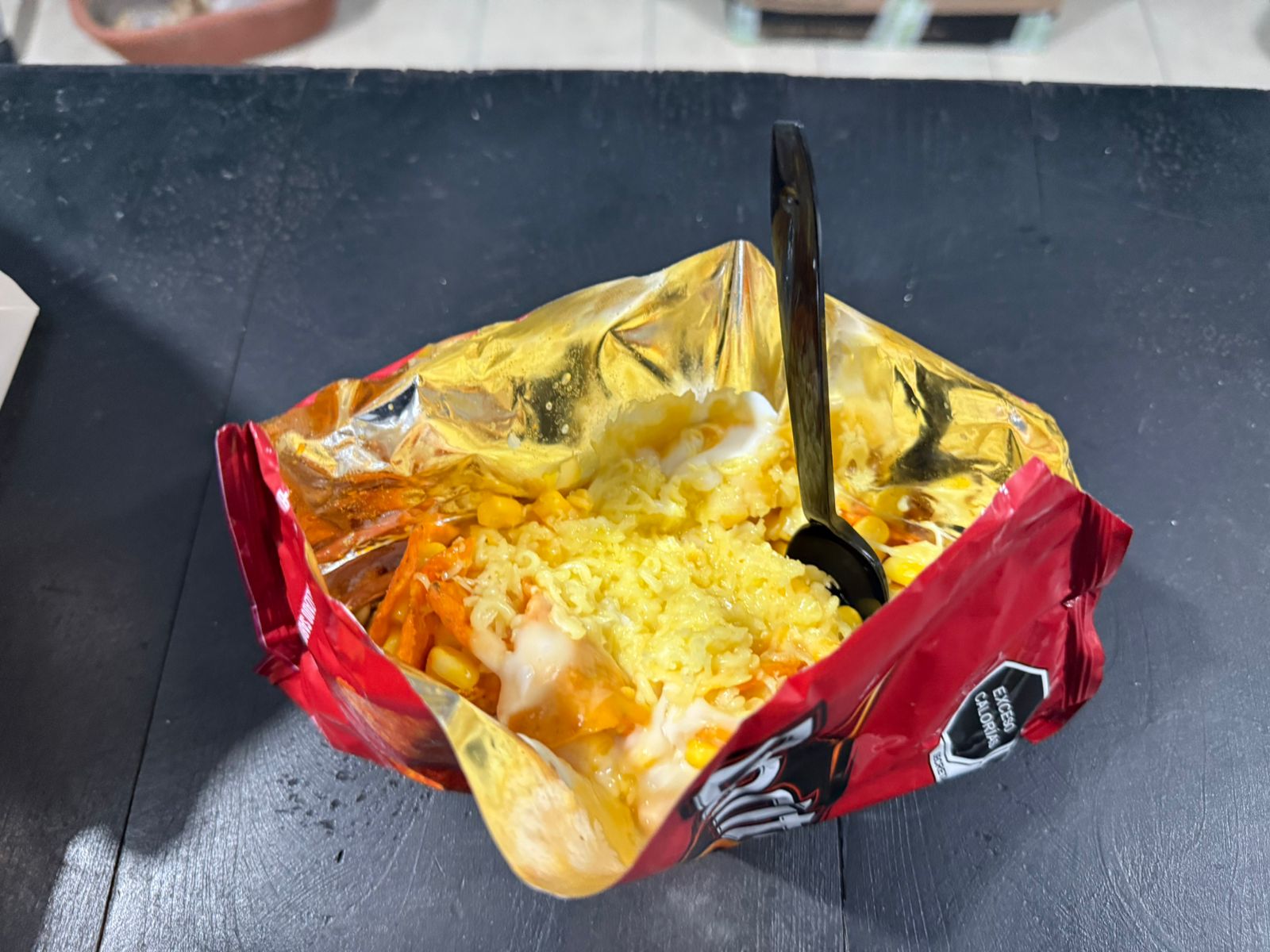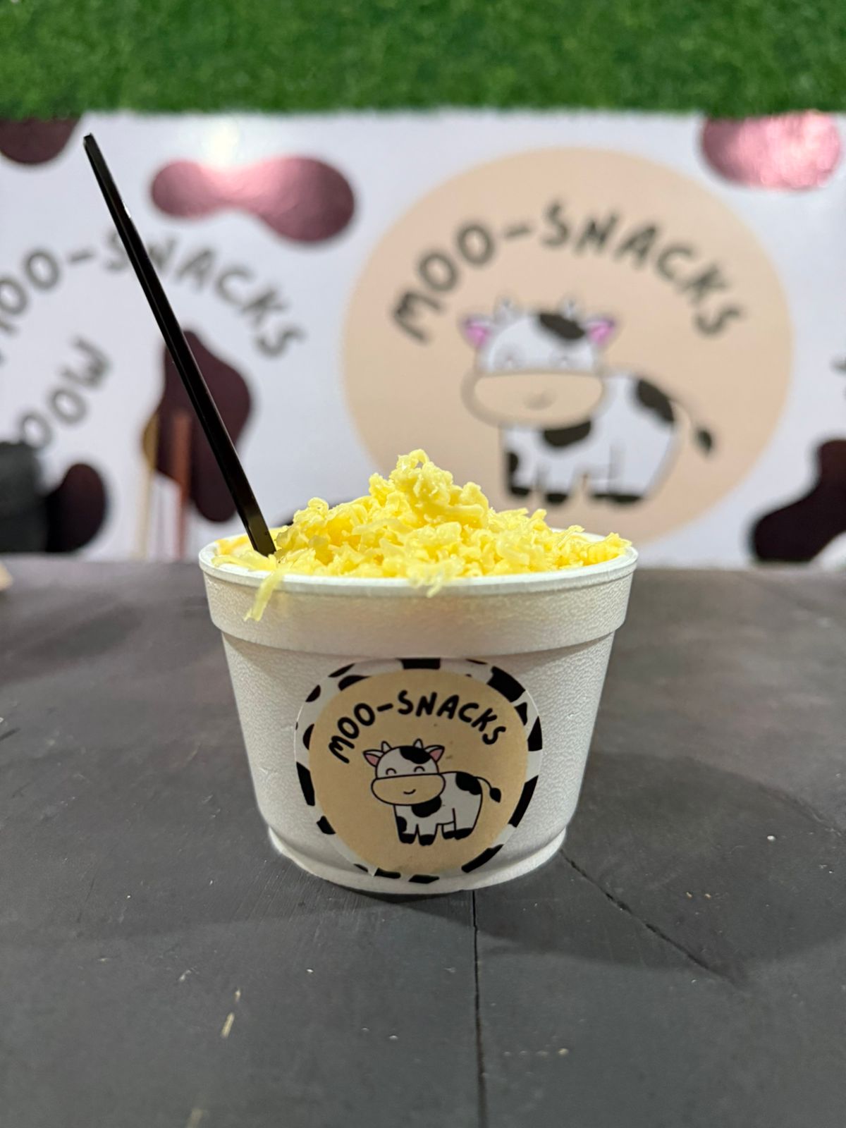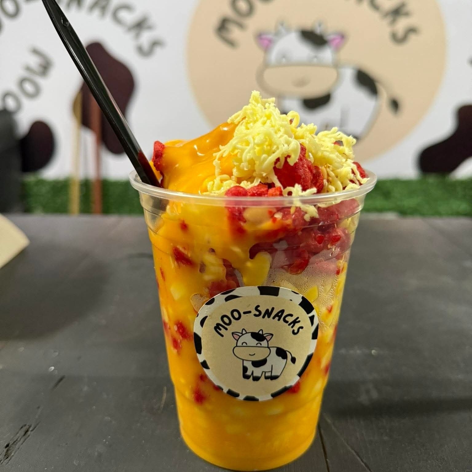 Vaso con queso amarillo, elote, Cheetos Flamin Hot y queso chihuahua rallado.