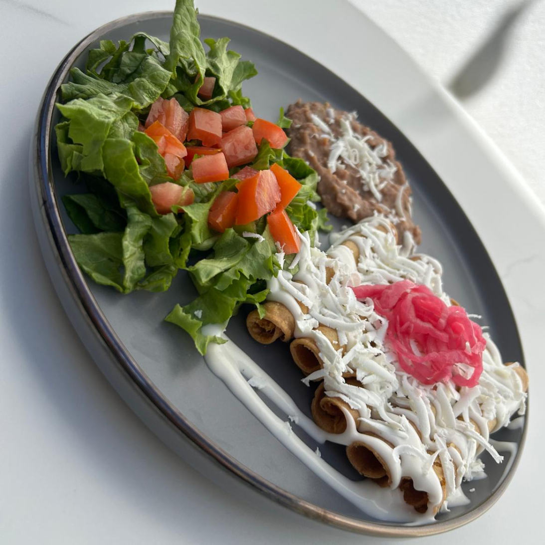 Flautas rellenas de pollo, Complemento: Frijoles, Ensalada, 5 pzas