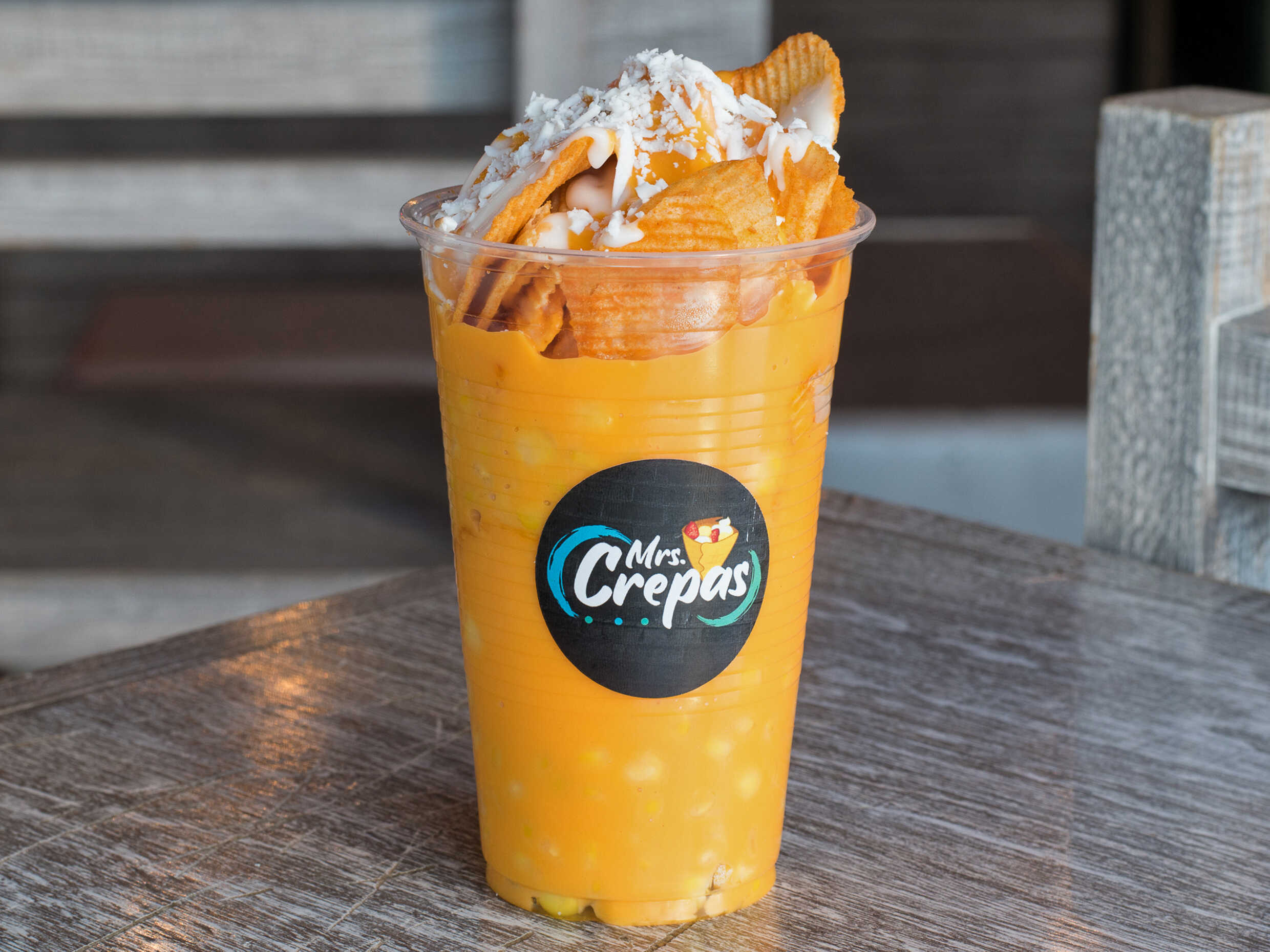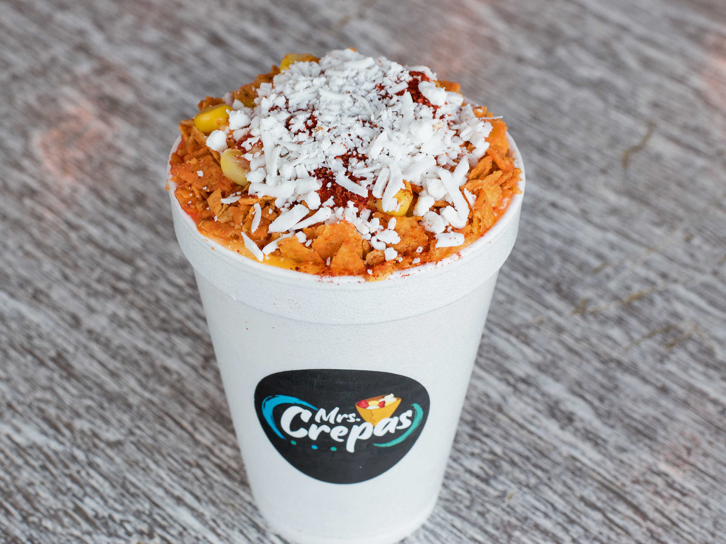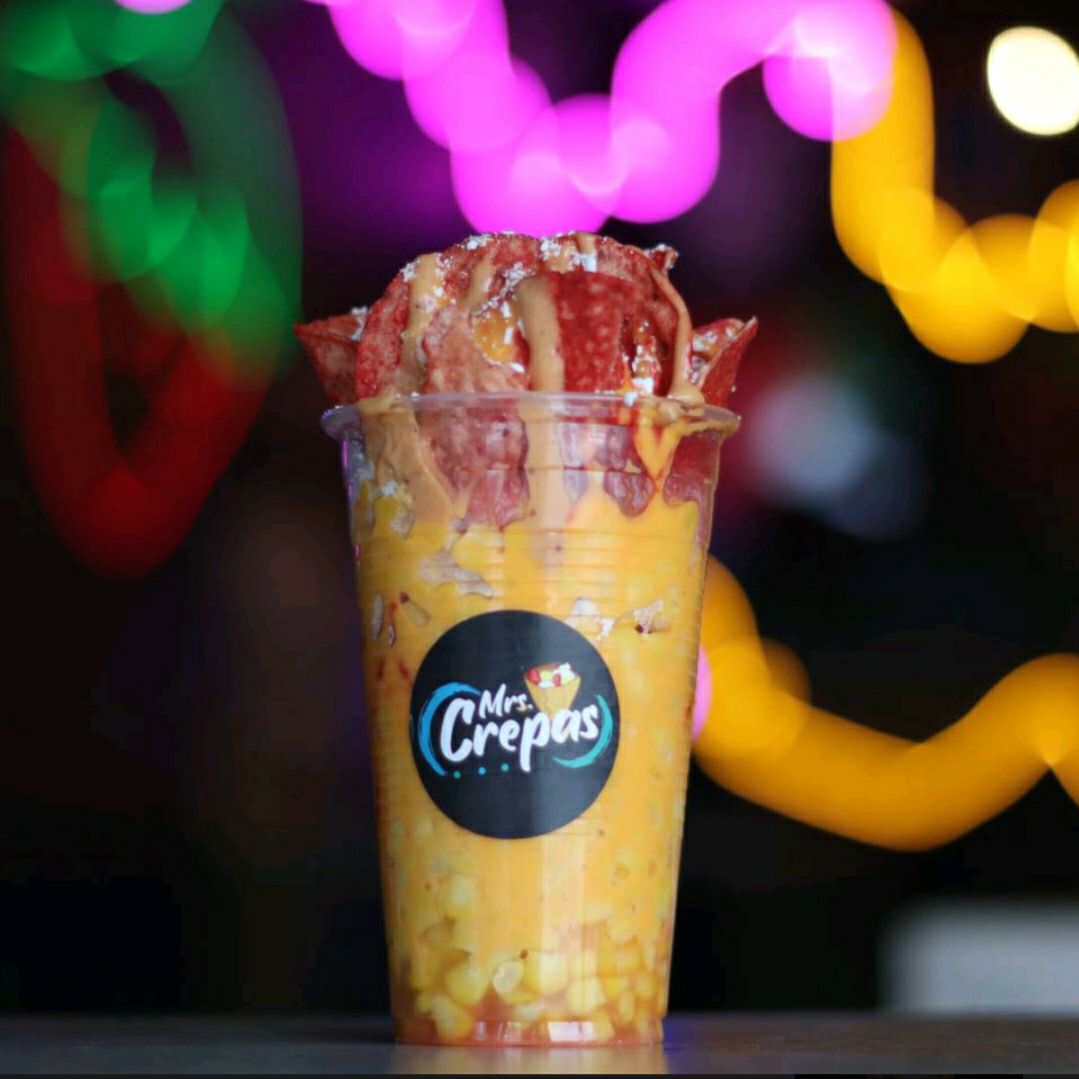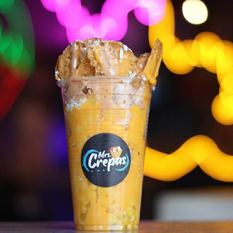 Delicioso vaso de elote con fritura acompañado de queso amarillo, crema, queso rayado y chipotle