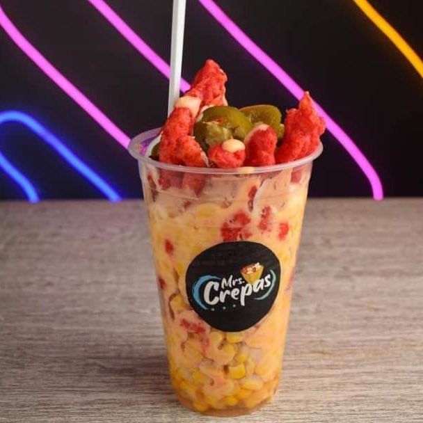 Delicioso elote en vaso con aderezo de crema, queso rayado y amarillo acompañado de chipotle