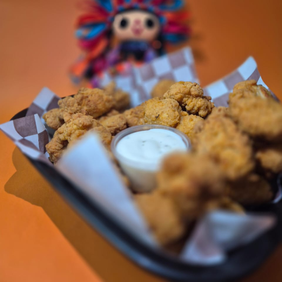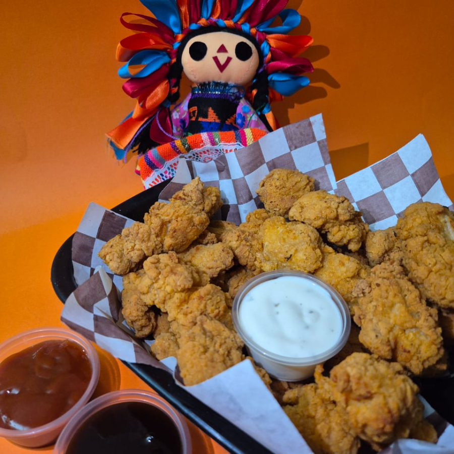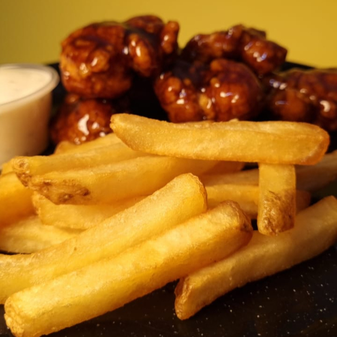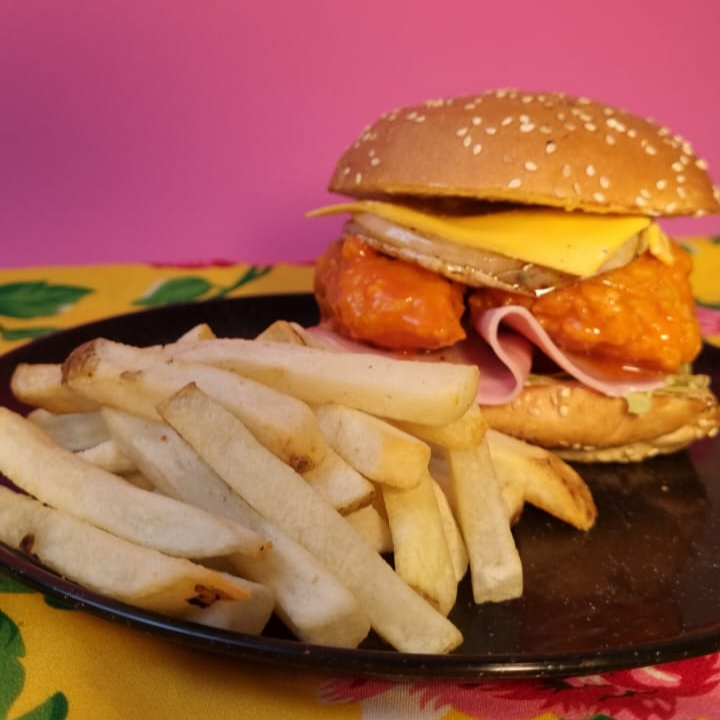Hamburguesa con boneless bañados en la salsa de tu elección, jamon, queso, cebolla, lechuga y tomate, llena de amor acompañada de papas todos los trucos.
