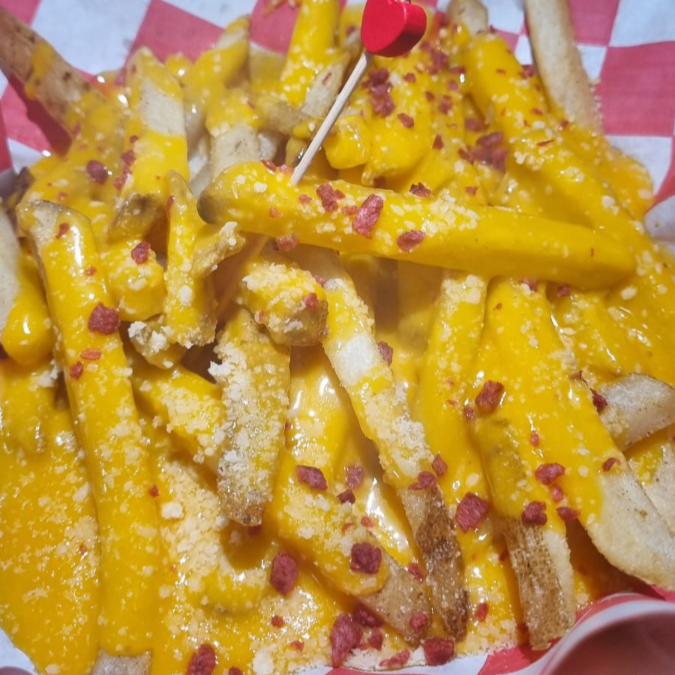 Papas a la francesa con un choorro de queso amarillo, queso parmesano y tocino.