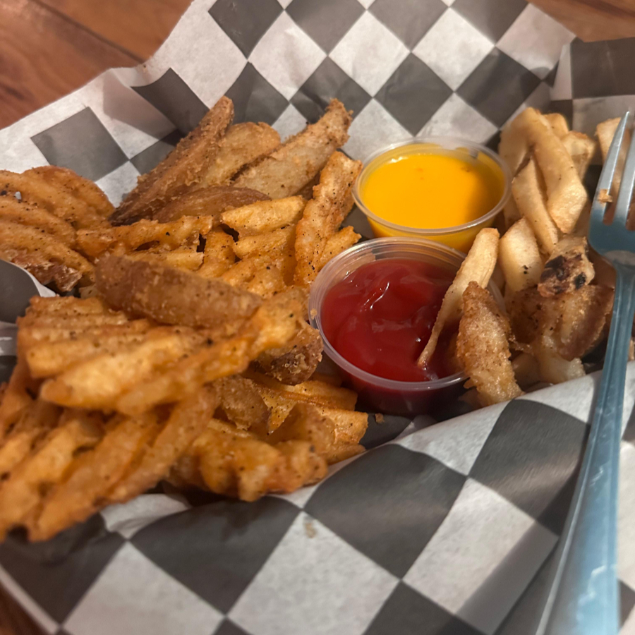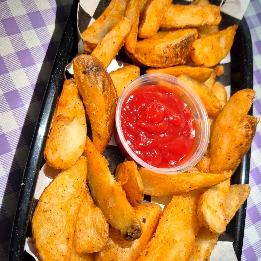 Papas a la francesa, criss cut y papa gajo con catsup o queso amarillo pa chopear.