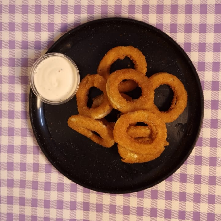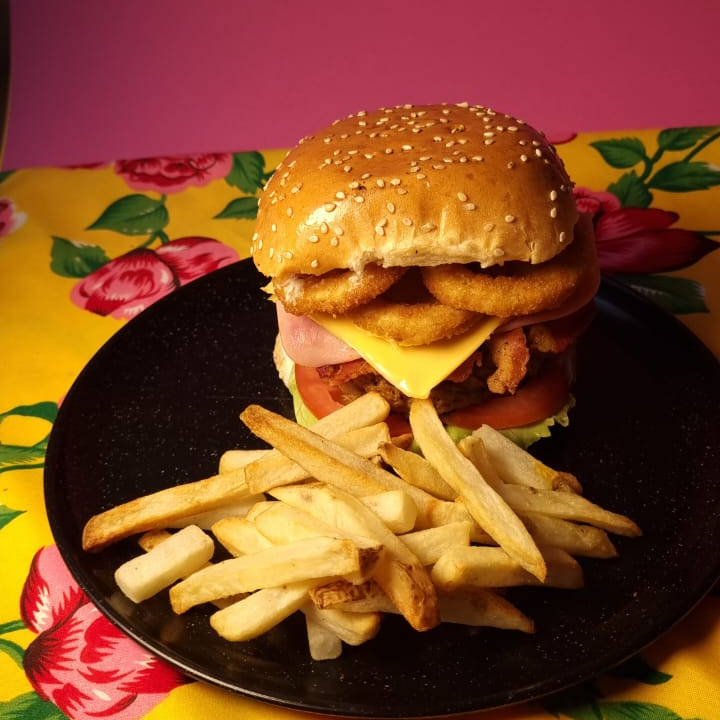 Hamburguesa con aros de cebolla, tocino, carne de res, jamon, queso, lechuga y tomate, llena de amor acompañada de papas todos los trucos.