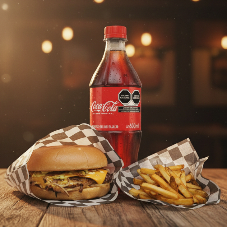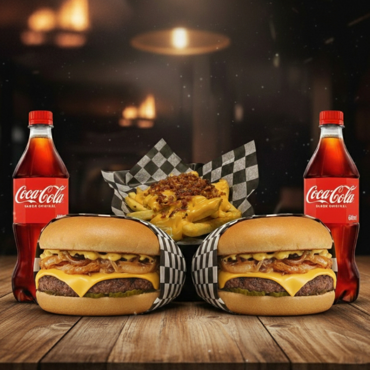 Dos cheeseburger sencillas, unas baconcheese fries y dos bebidas a elegir