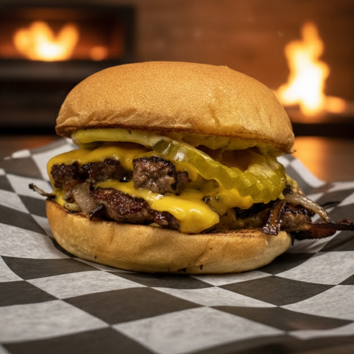 Hamburguesa en pan brioche, doble carne OK, doble queso americano, aderezo de la casa, pepinillos y tocino. La carne OK se aplasta en la plancha junto con delgadas tiras de cebolla que al caramelizar le dan un sabor delicioso.