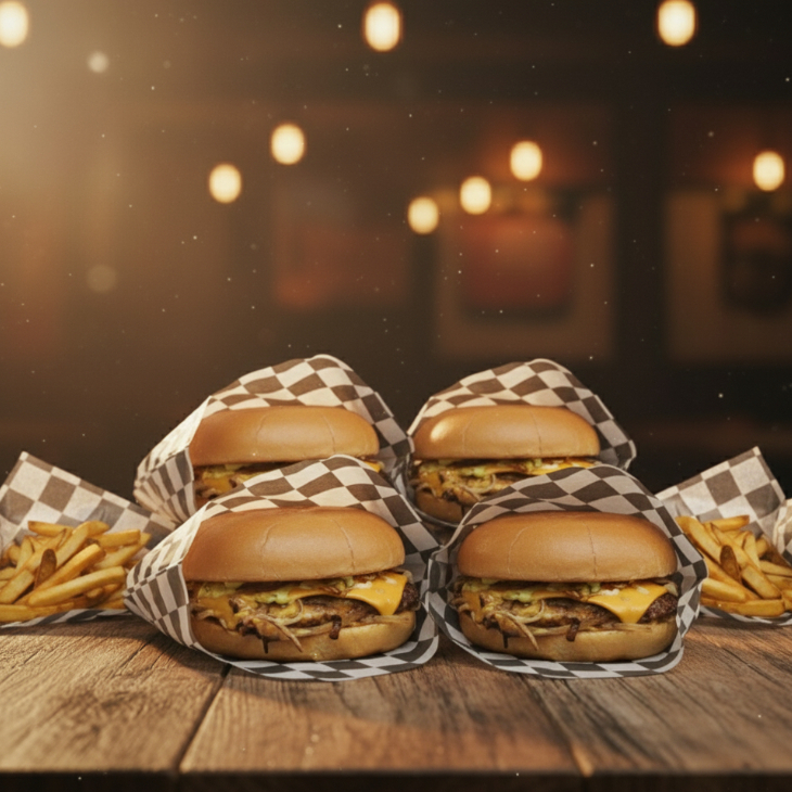 Cuatro cheeseburger sencillas y dos ordenes de classic fries.
