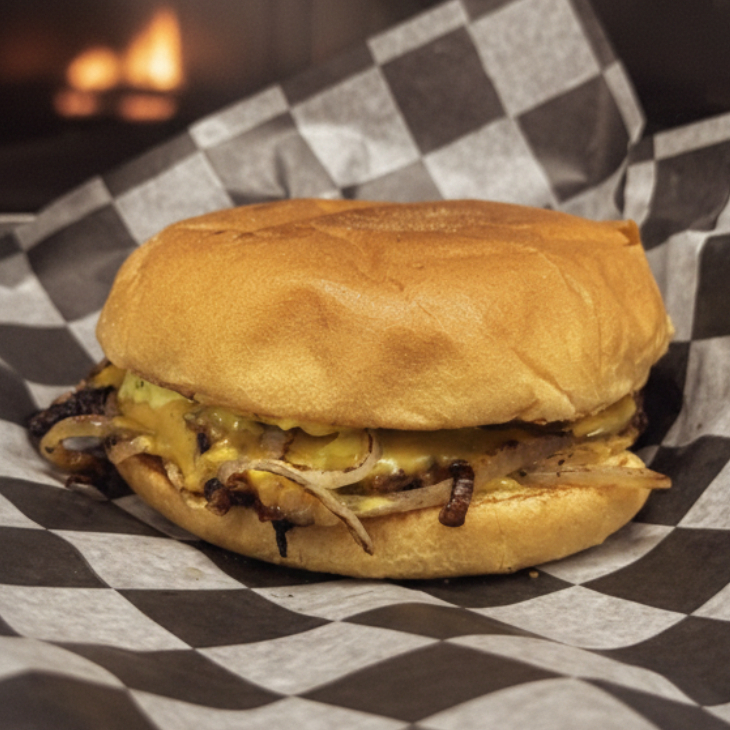Hamburguesa en pan brioche, doble carne OK, doble queso americano, aderezo de la casa y pepinillos. La carne OK se aplasta en la plancha junto con delgadas tiras de cebolla que al caramelizar le dan un sabor delicioso.