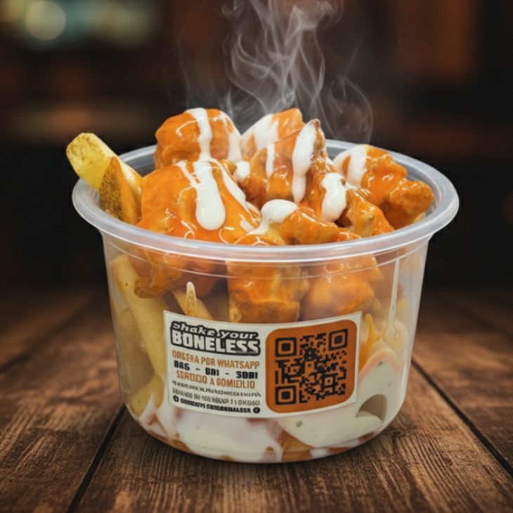 Vaso grande (1 LT) de Boneless acompañados de papas a la francesas y bañados en salsas de tu elección.