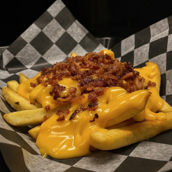 Papas a la francesa bañadas con queso cheedar y deliciosos trozos de tocino.