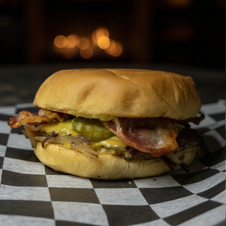 Hamburguesa en pan brioche, carne OK, queso americano, aderezo de la casa, pepinillos y tocino. La carne OK se aplasta en la plancha junto con delgadas tiras de cebolla que al caramelizar le dan un sabor delicioso.