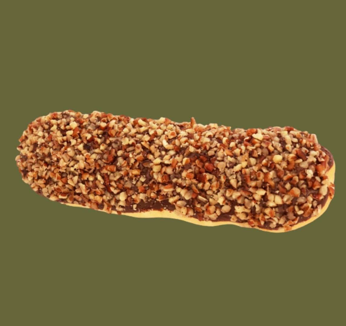 Gluten Free con harina deshidratada de papa orgánica, relleno de cacao; cubierta de cacao con nuez.