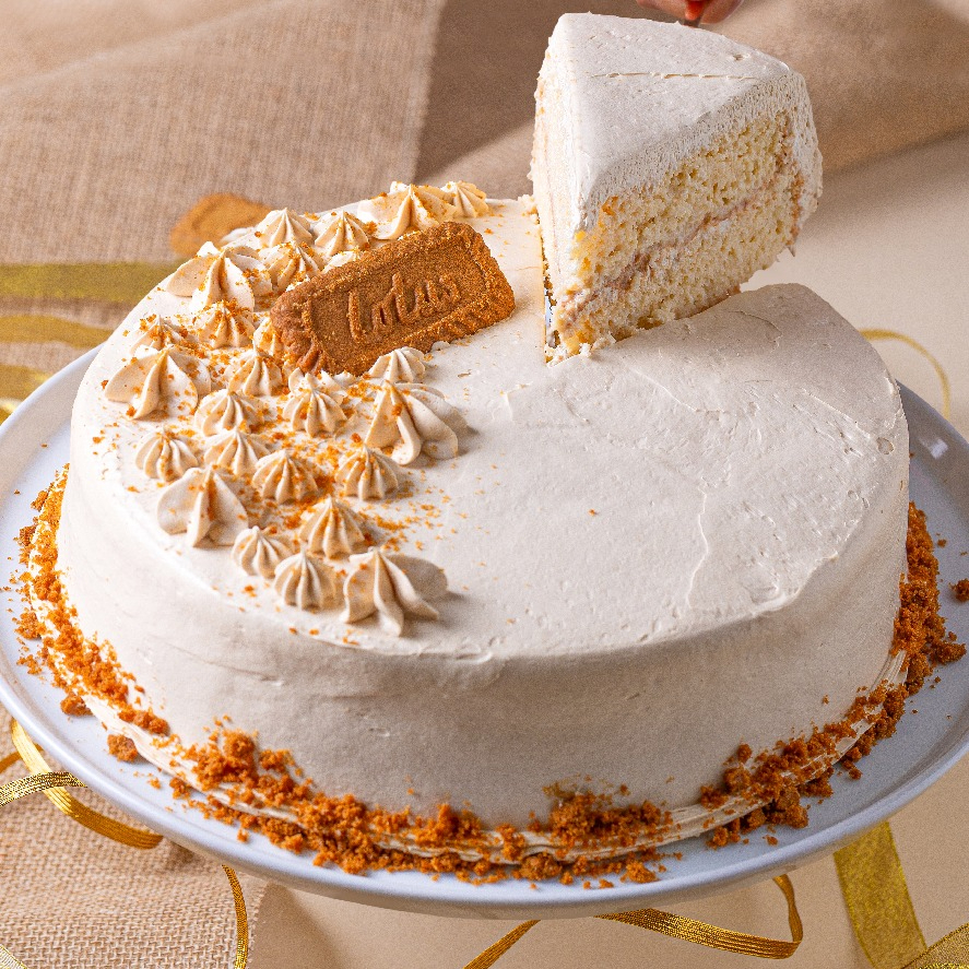 Pan de vainilla con mezcla de 3 leches, relleno y cubierto con betún de lotus (caramelo), decorado con botones de betún de lotus y galleta lotus.