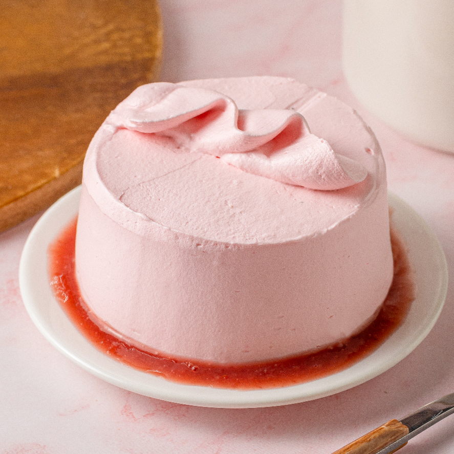 Pan sabor cereza, ligeramente húmedecido,relleno y decorado con betún de queso.