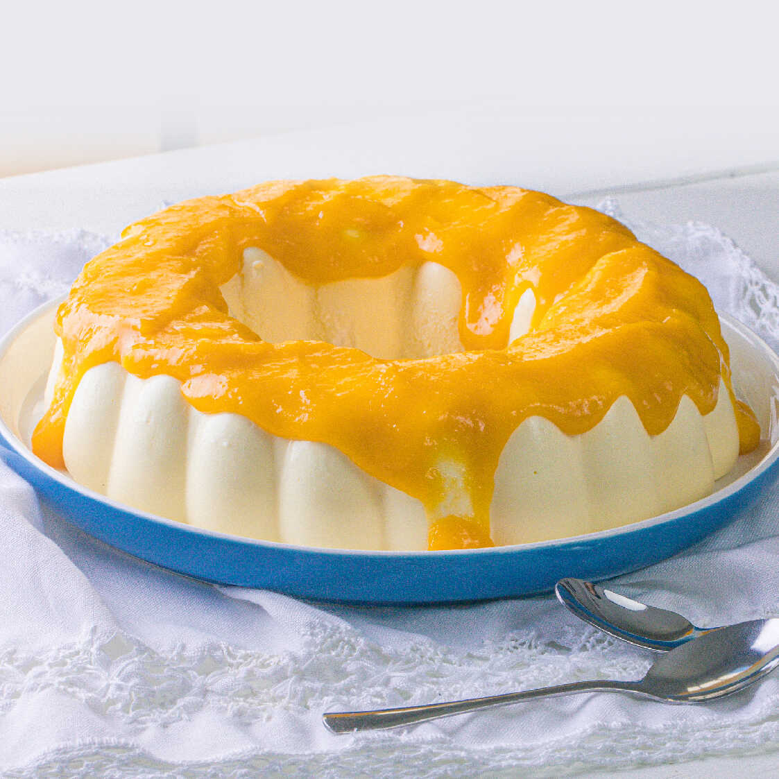 Pan de vainilla decorado y relleno de betún con yogurt de mango, decorado con una salsa de mango.