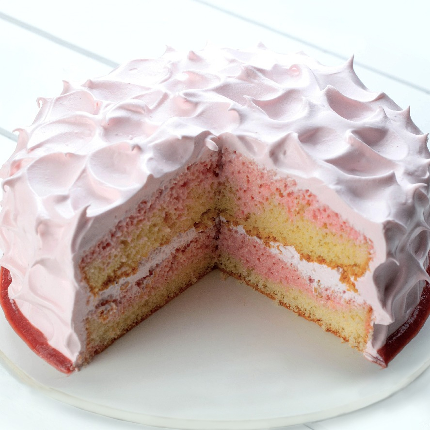 Pan de vainilla decorado y relleno de betún con yogurt de fresa, decorado con una salsa de fresa