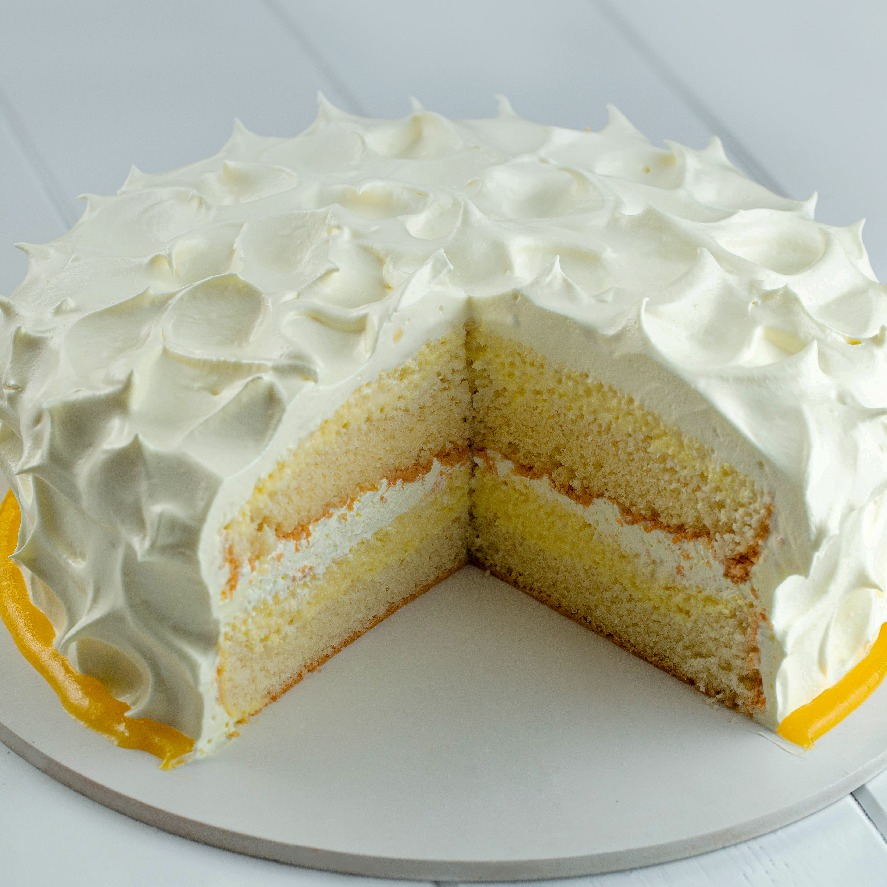 Pan sabor coco ligeramente húmedecido, con esencia de coco betún de crema , decorado con coco y cerezas.